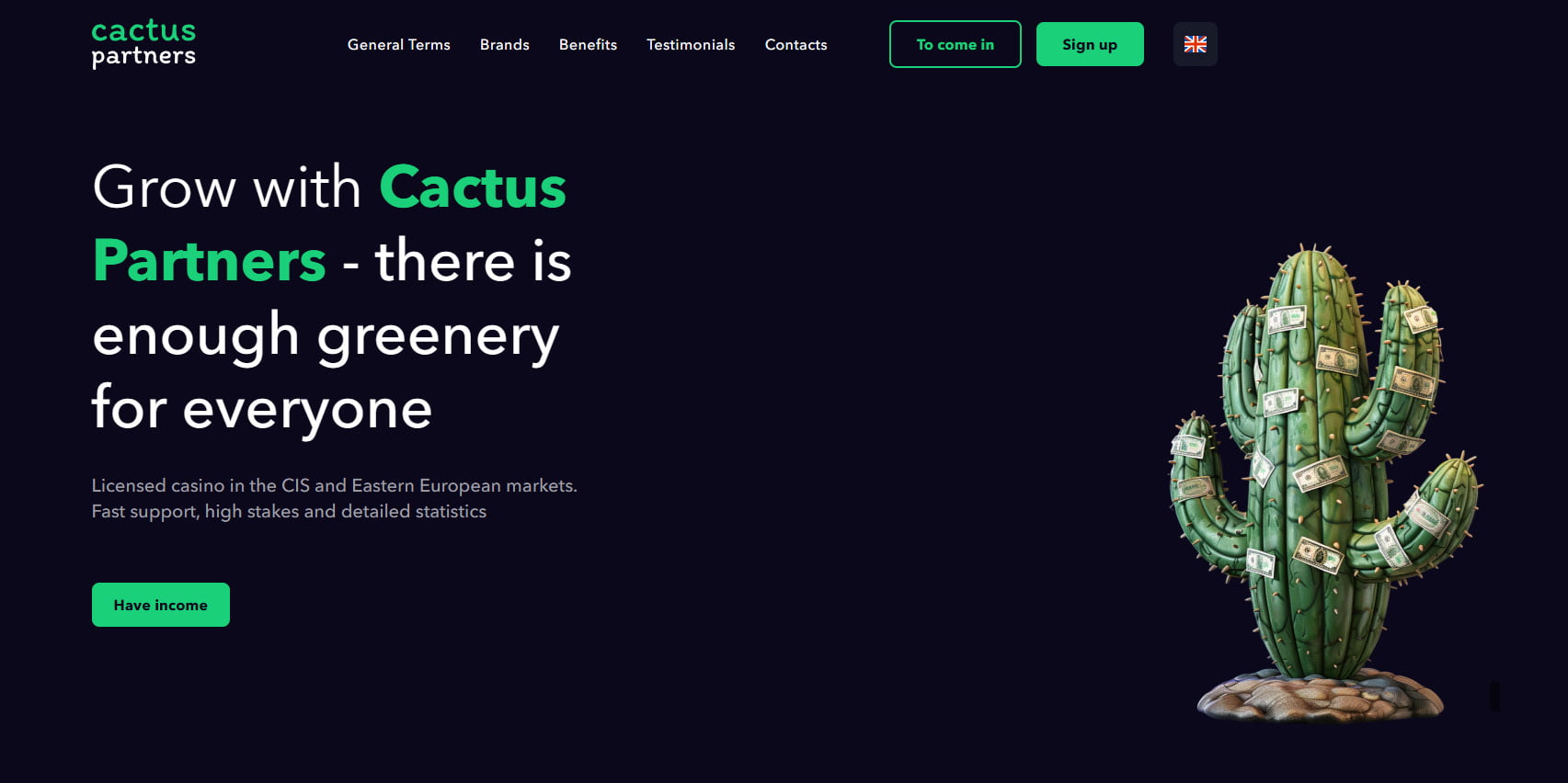 Cactus Partners — партнёрская программа (официальный прямой рекламодатель) бренда Cactus. Работает с тематикой онлайн-казино. Условия сотрудничества: RevShare 20-50%, CPA до 200$30-120 $, Гибрид от 20%+20$ до 30%+50$. Выплаты производят 1-2 раза в месяц. Отрицательный баланс не переносится (NNCO) — обнуляется. Брендовый трафик принимается (разрешен). Далее детально рассмотрим партнёрку Cactus Partners.