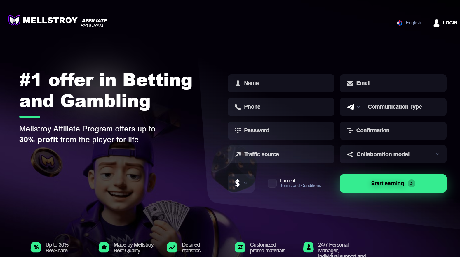 Mellstroy Partners — официальная партнерская программа казино Mellstroy, предлагающая RevShare от 30% GGR, Click2Reg до 73% и Reg2Dep до 42%.