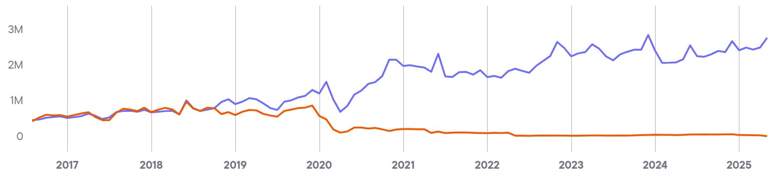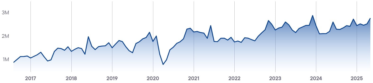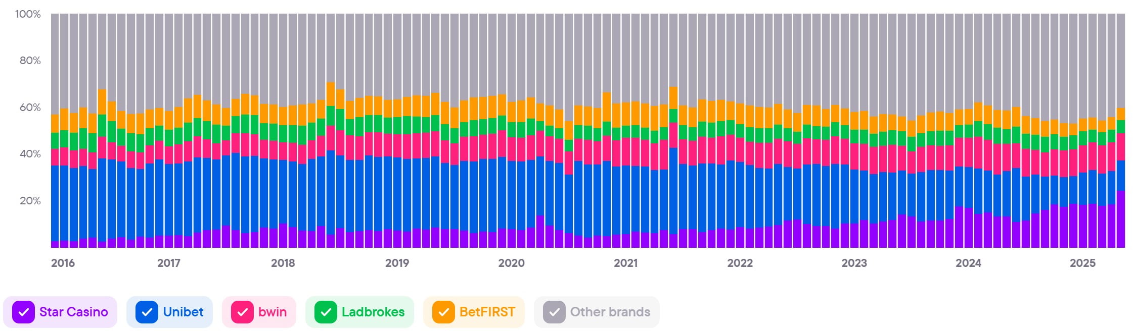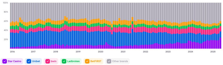 Показывает совокупный уровень вовлечённости и интереса ко всем брендам в стране. Этот показатель служит барометром для индустрии iGaming и объединяет различные индикаторы, чтобы дать общее представление о тенденциях и изменениях на рынке.