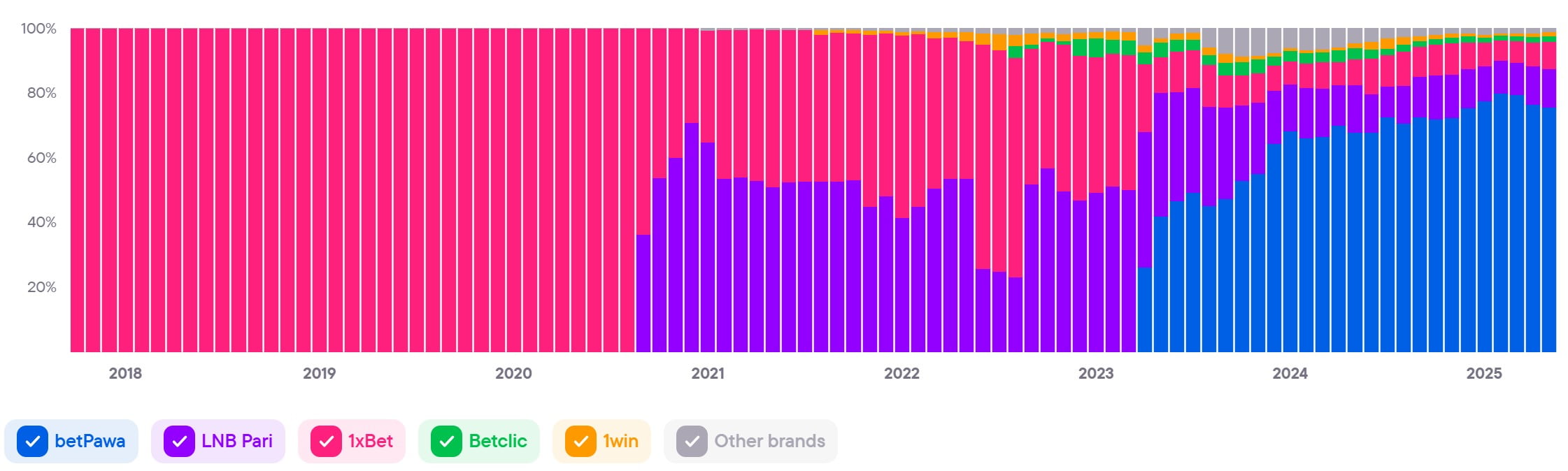 Показывает совокупный уровень вовлечённости и интереса ко всем брендам в стране. Этот показатель служит барометром для индустрии iGaming и объединяет различные индикаторы, чтобы дать общее представление о тенденциях и изменениях на рынке.