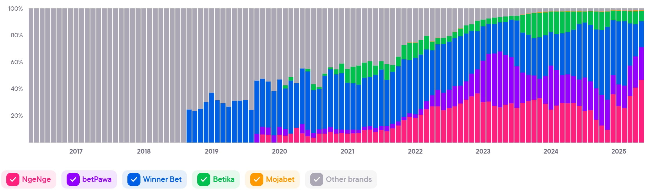 Показывает совокупный уровень вовлечённости и интереса ко всем брендам в стране. Этот показатель служит барометром для индустрии iGaming и объединяет различные индикаторы, чтобы дать общее представление о тенденциях и изменениях на рынке.