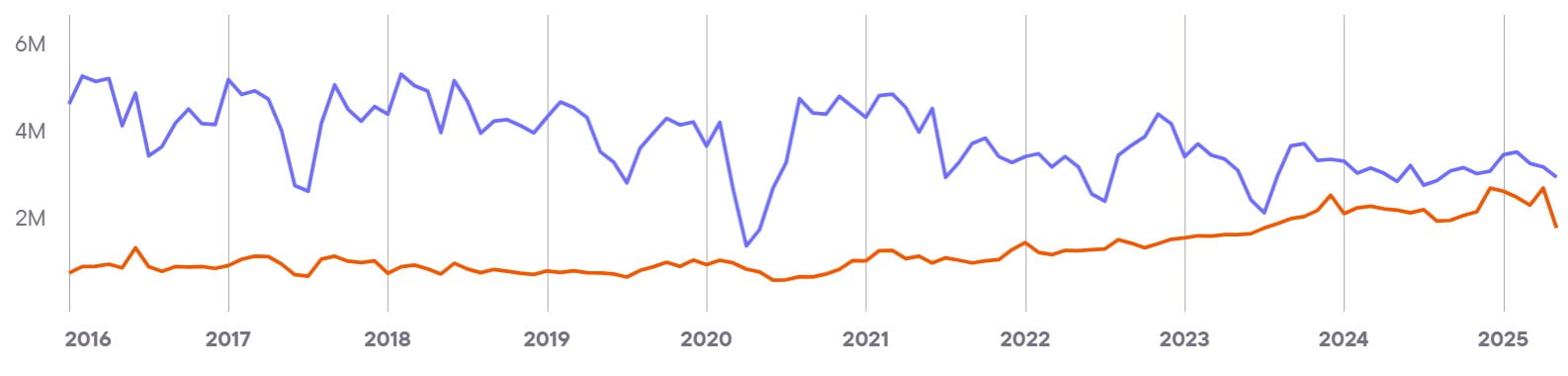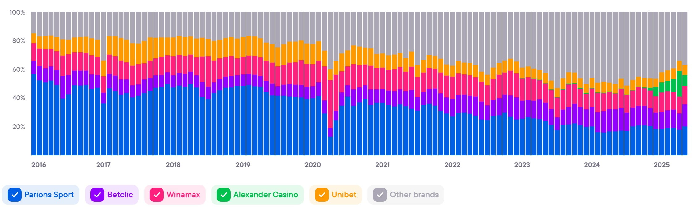 Показывает совокупный уровень вовлечённости и интереса ко всем брендам в стране. Этот показатель служит барометром для индустрии iGaming и объединяет различные индикаторы, чтобы дать общее представление о тенденциях и изменениях на рынке.