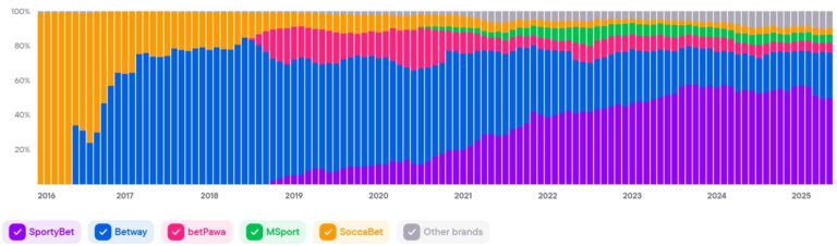 SportyBet является ведущим букмекером на рынке Ганы, что, вероятно, обусловлено его сотрудничеством с крупными медиаплатформами, такими как радиостанция Sporty FM и Sporty TV — площадка, предоставляющая спортивный контент.