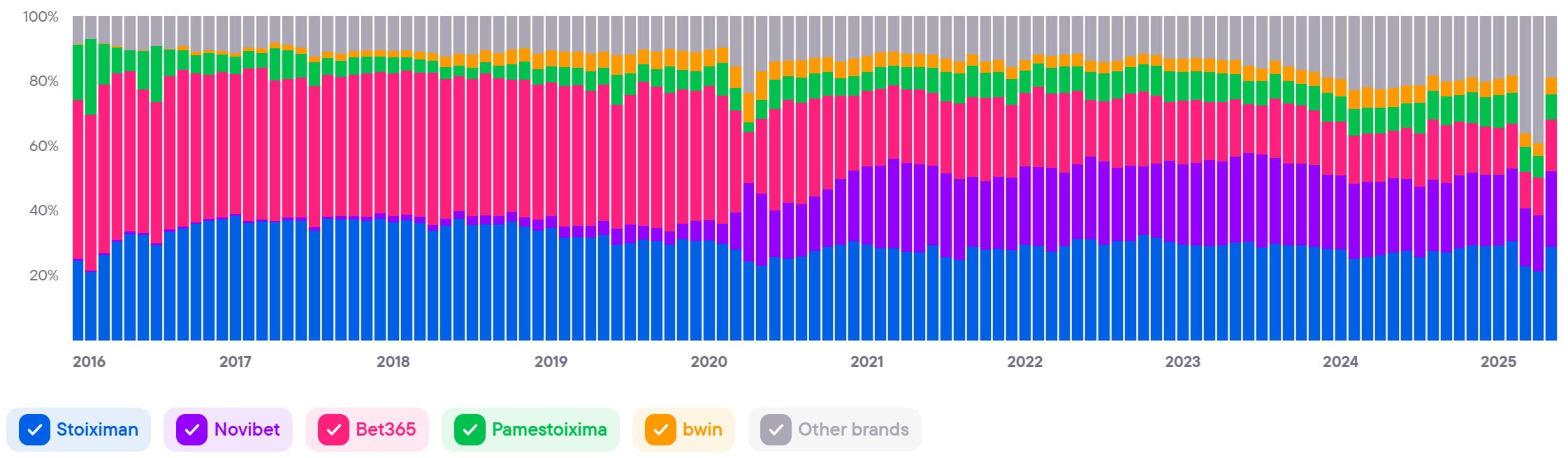Согласно последним данным, 53% греческих игроков отдают предпочтение беттингу, тогда как 34,6% выбирают слоты.