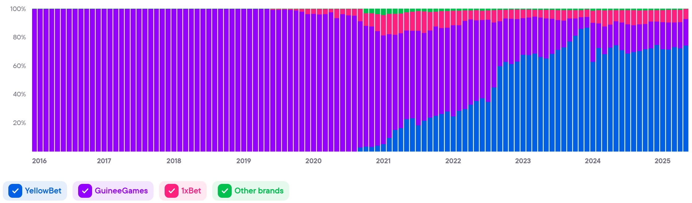 Показывает совокупный уровень вовлечённости и интереса ко всем брендам в стране. Этот показатель служит барометром для индустрии iGaming и объединяет различные индикаторы, чтобы дать общее представление о тенденциях и изменениях на рынке.