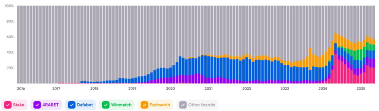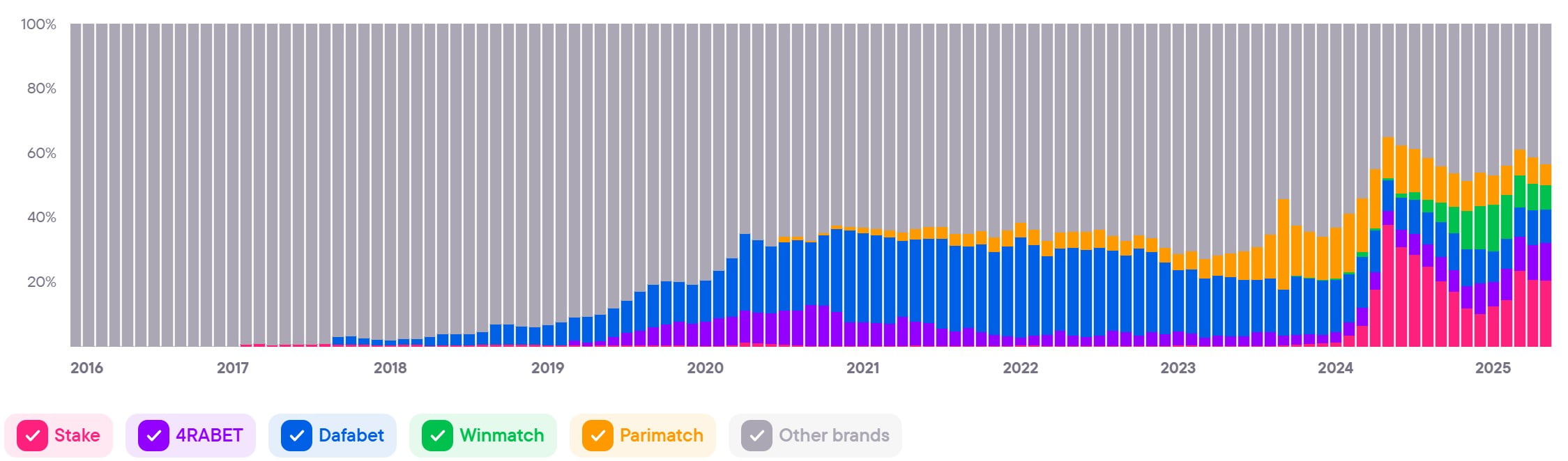Показывает совокупный уровень вовлечённости и интереса ко всем брендам в стране. Этот показатель служит барометром для индустрии iGaming и объединяет различные индикаторы, чтобы дать общее представление о тенденциях и изменениях на рынке.