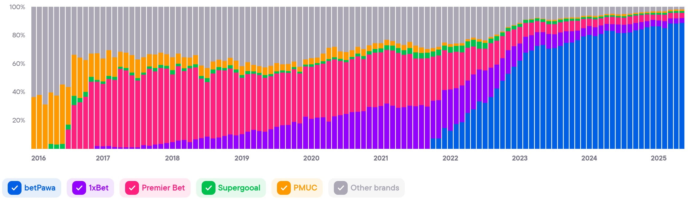 Показывает совокупный уровень вовлечённости и интереса ко всем брендам в стране. Этот показатель служит барометром для индустрии iGaming и объединяет различные индикаторы, чтобы дать общее представление о тенденциях и изменениях на рынке.