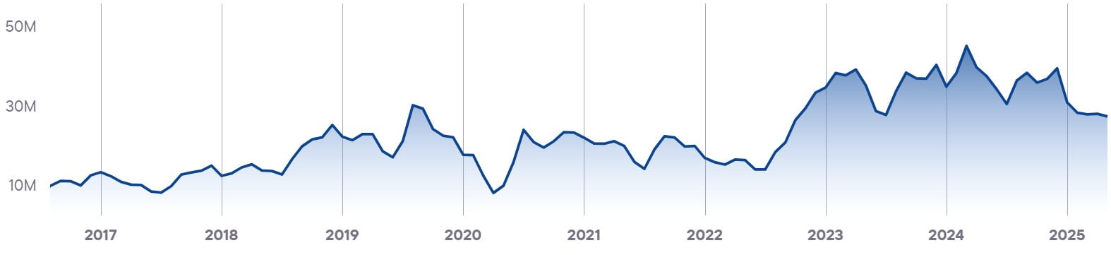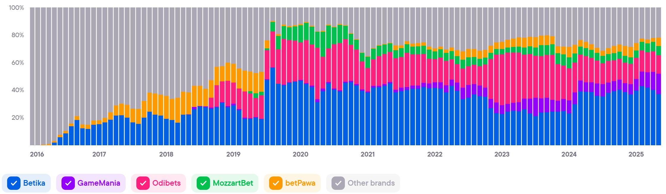 Показывает совокупный уровень вовлечённости и интереса ко всем брендам в стране. Этот показатель служит барометром для индустрии iGaming и объединяет различные индикаторы, чтобы дать общее представление о тенденциях и изменениях на рынке.