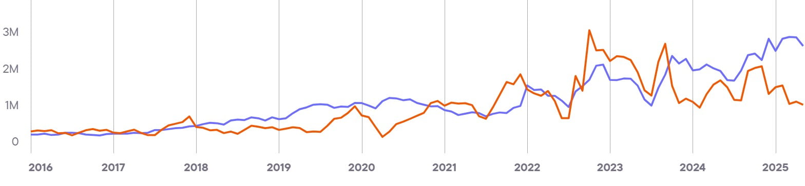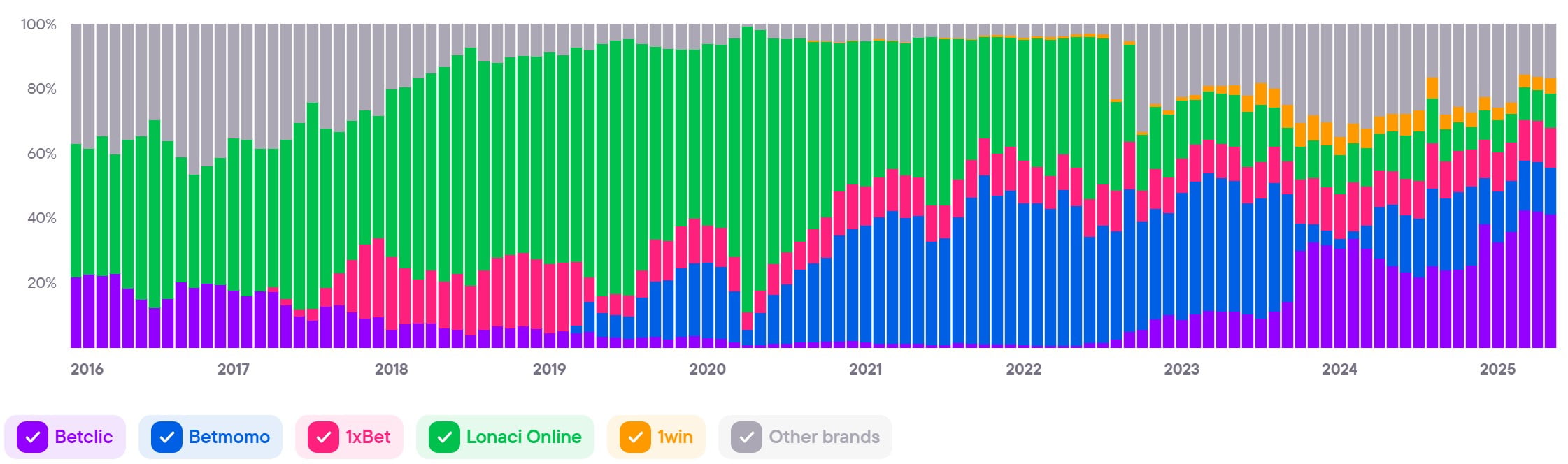Показывает совокупный уровень вовлечённости и интереса ко всем брендам в стране. Этот показатель служит барометром для индустрии iGaming и объединяет различные индикаторы, чтобы дать общее представление о тенденциях и изменениях на рынке.