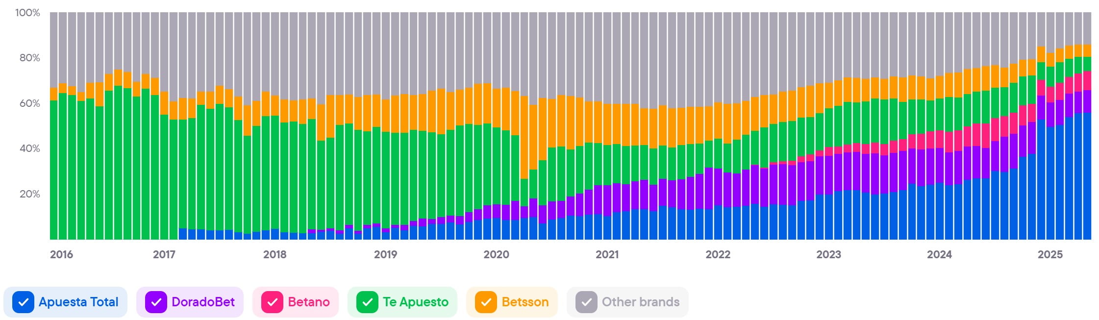 Показывает совокупный уровень вовлечённости и интереса ко всем брендам в стране. Этот показатель служит барометром для индустрии iGaming и объединяет различные индикаторы, чтобы дать общее представление о тенденциях и изменениях на рынке.