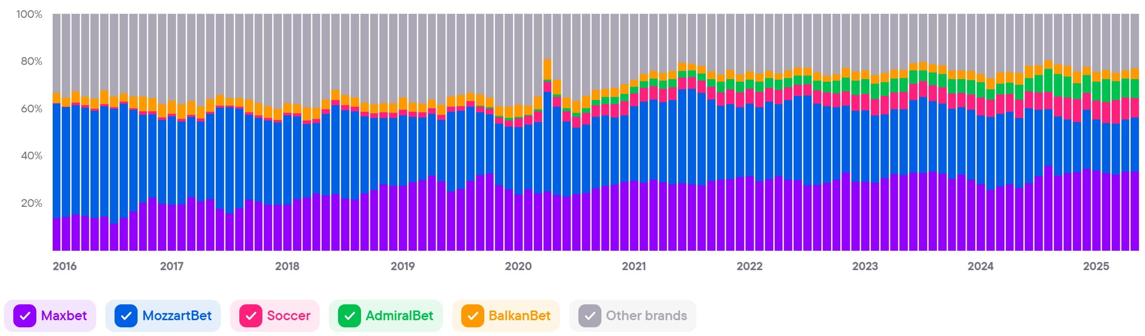Показывает совокупный уровень вовлечённости и интереса ко всем брендам в стране. Этот показатель служит барометром для индустрии iGaming и объединяет различные индикаторы, чтобы дать общее представление о тенденциях и изменениях на рынке.