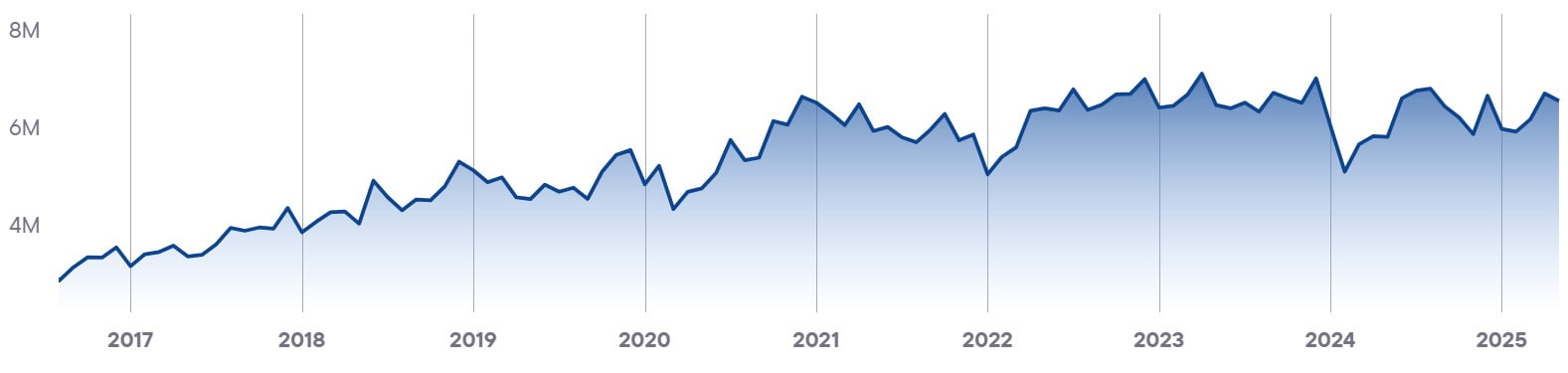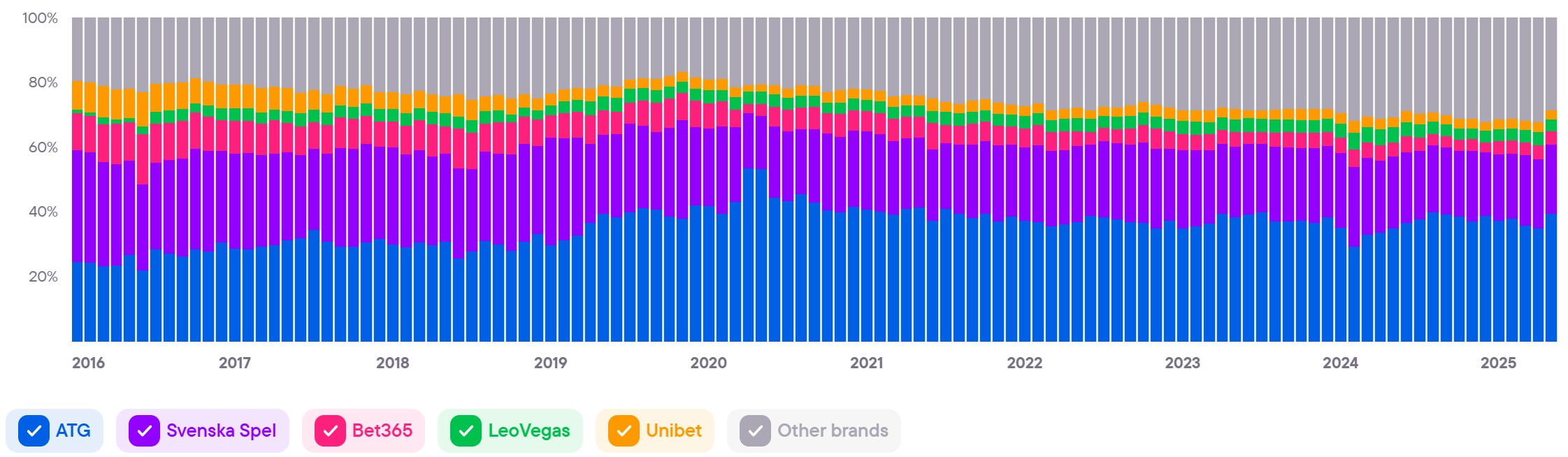 Показывает совокупный уровень вовлечённости и интереса ко всем брендам в стране. Этот показатель служит барометром для индустрии iGaming и объединяет различные индикаторы, чтобы дать общее представление о тенденциях и изменениях на рынке.