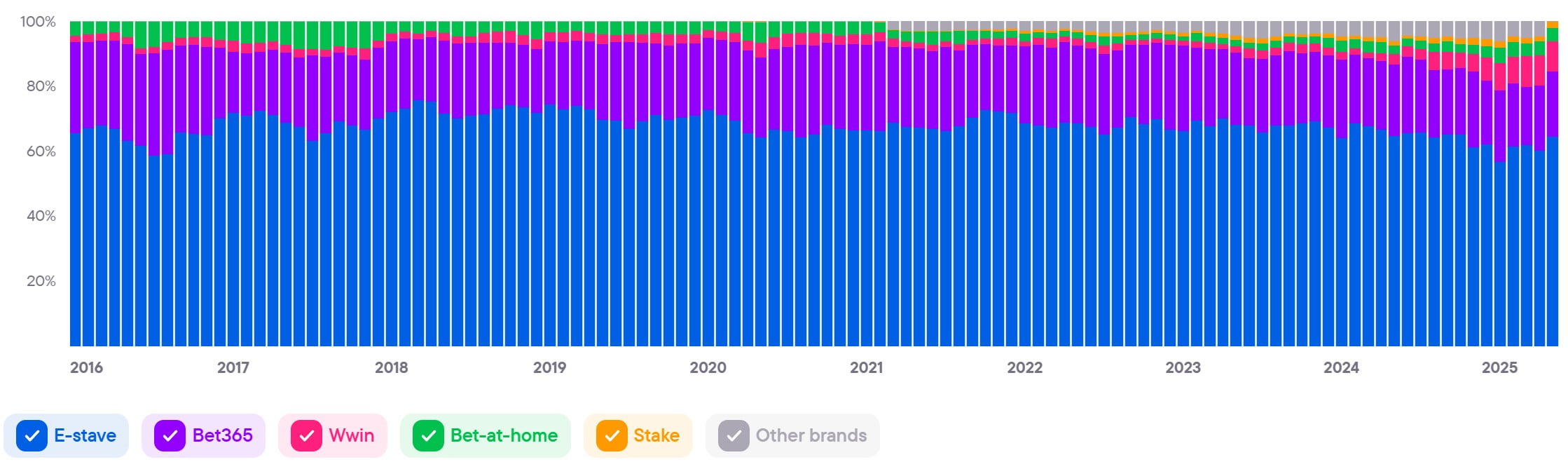 Показывает совокупный уровень вовлечённости и интереса ко всем брендам в стране. Этот показатель служит барометром для индустрии iGaming и объединяет различные индикаторы, чтобы дать общее представление о тенденциях и изменениях на рынке.