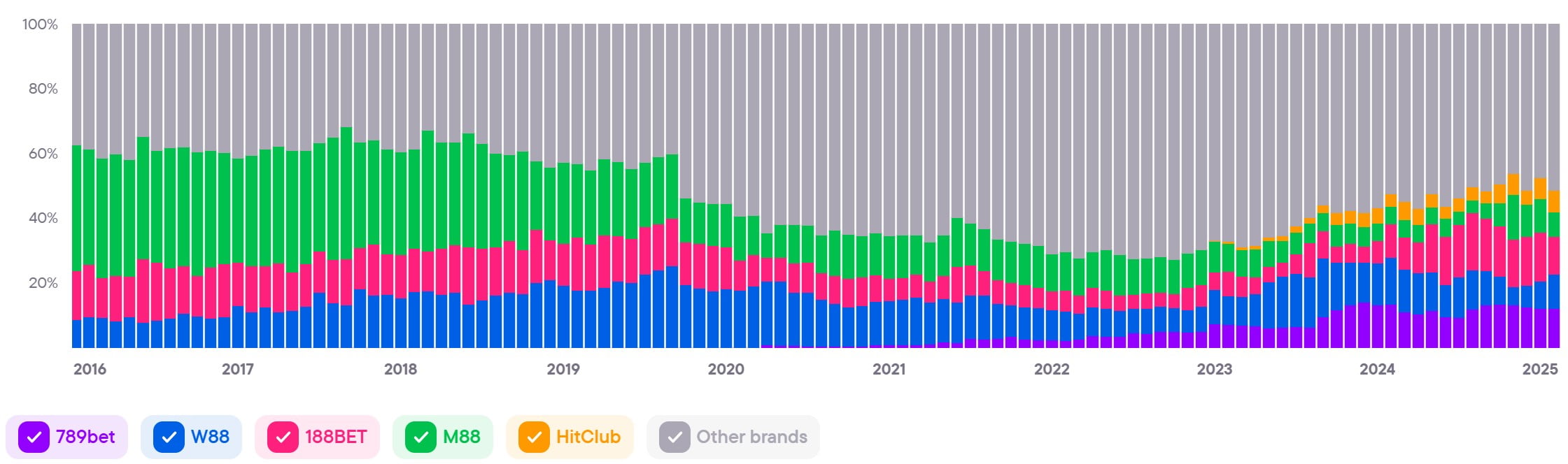 Показывает совокупный уровень вовлечённости и интереса ко всем брендам в стране. Этот показатель служит барометром для индустрии iGaming и объединяет различные индикаторы, чтобы дать общее представление о тенденциях и изменениях на рынке.