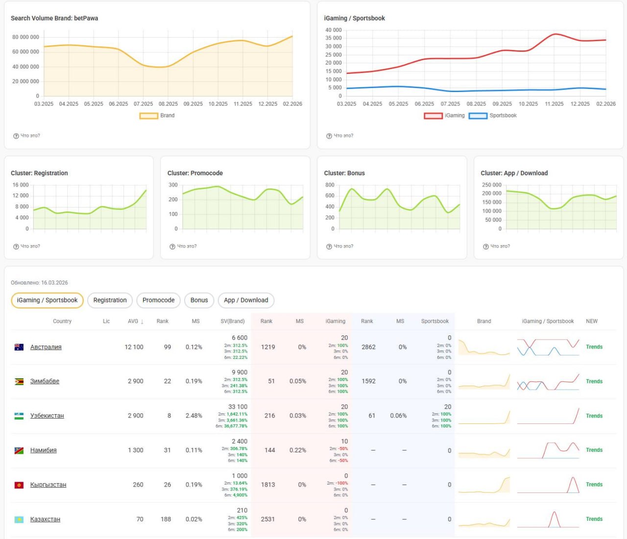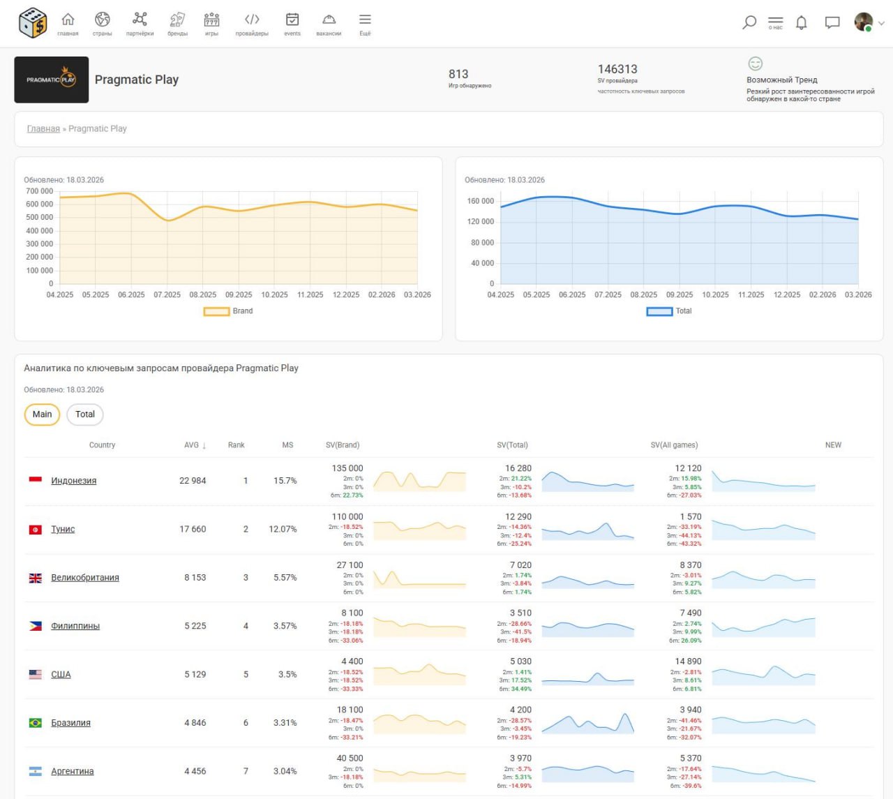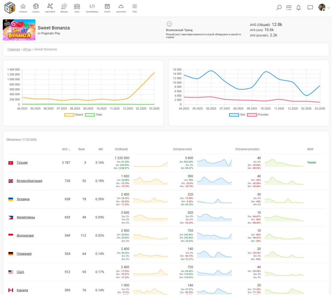 И так, выпускаю официально альфу аналитики брендов / игр / провайдеров, на основе частотности ключевых запросов из Google для разных стран.