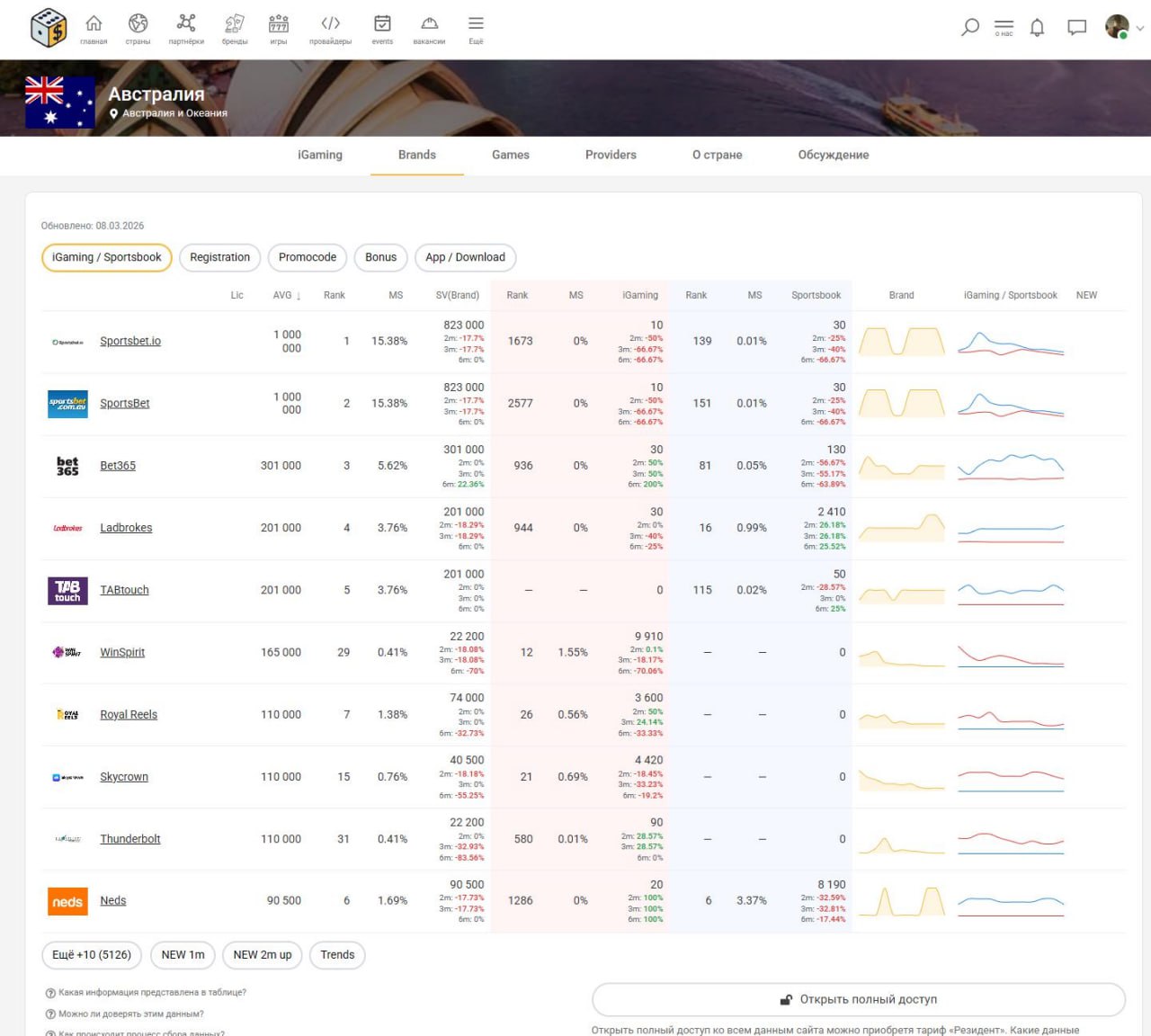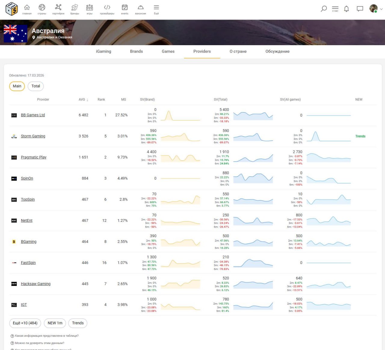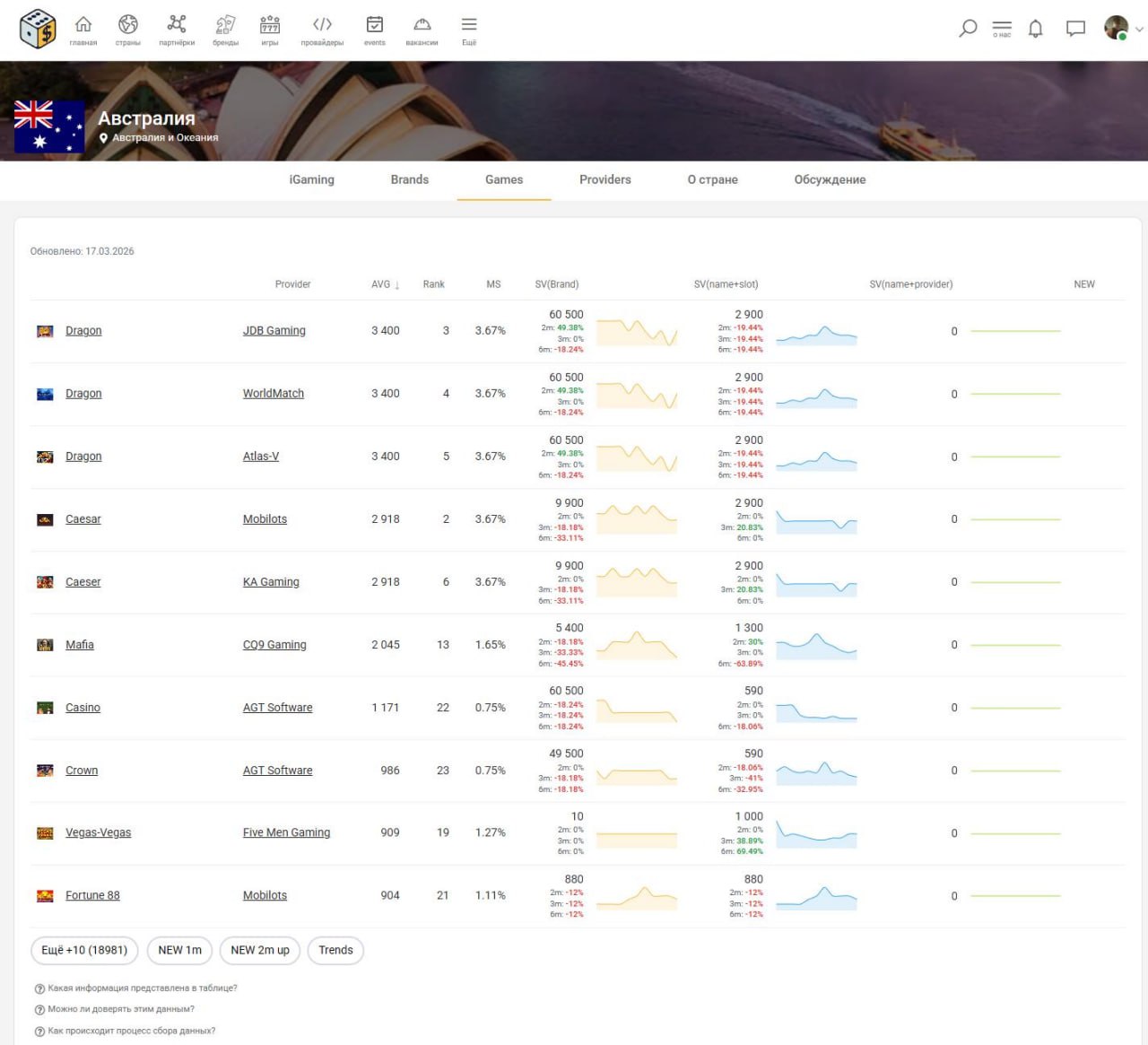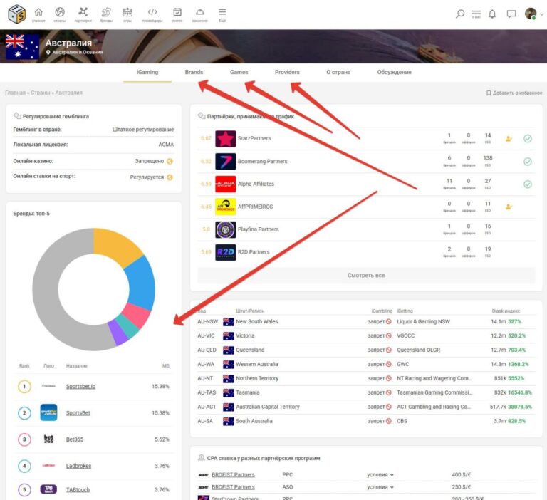 Все данные по брендам, играм, провайдерам так же расфасованы по странам. На странице страны вы можете увидеть как основные блоки вида «топ-5» для брендов, игр и провайдеров, так и отдельные вкладки с ними же. Вся представленная информация на странице одной страны — высчитана именно по этой стране. В итоге можно примерно видеть общую картину «рынка» азартных игр, а также ориентироваться в заинтересованности местными жителями в определенных брендах и играх.