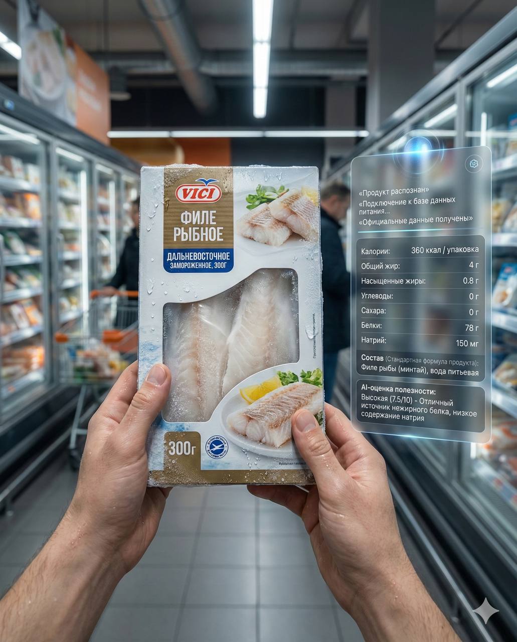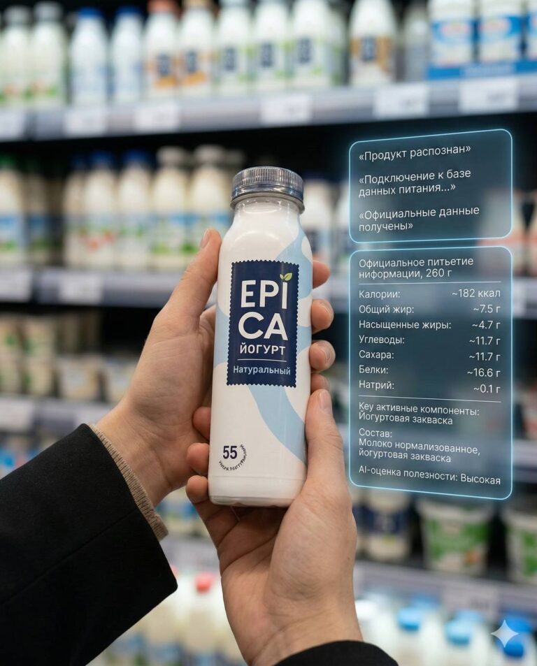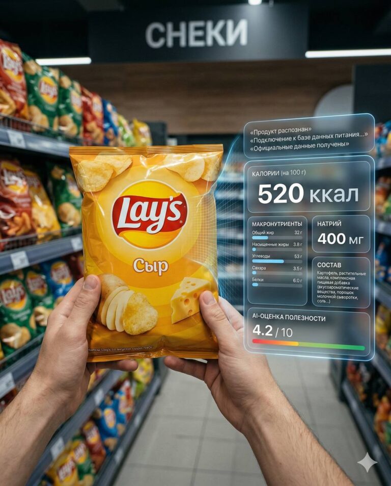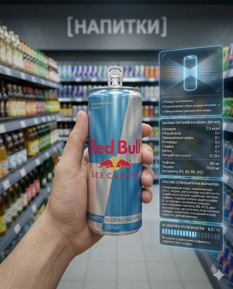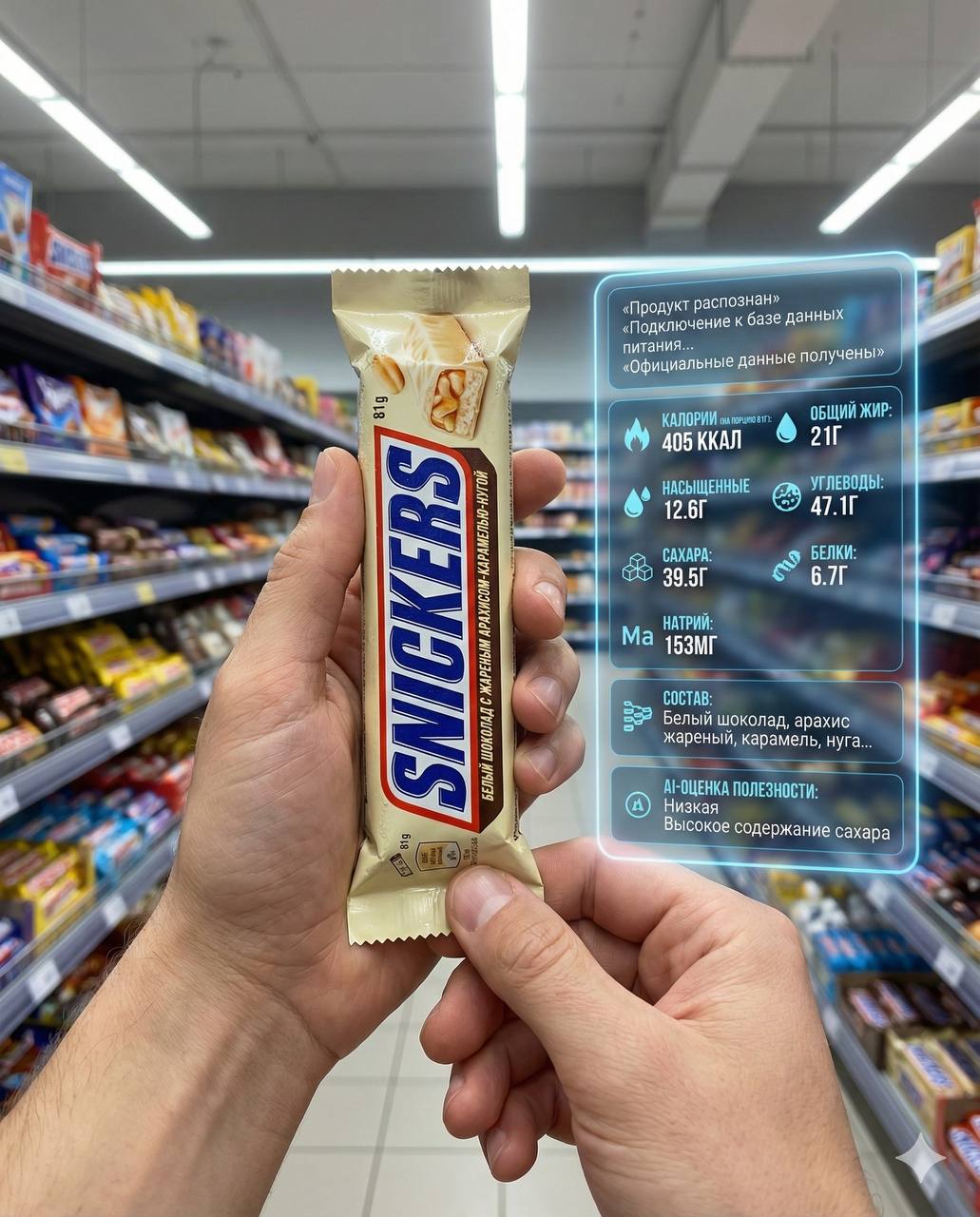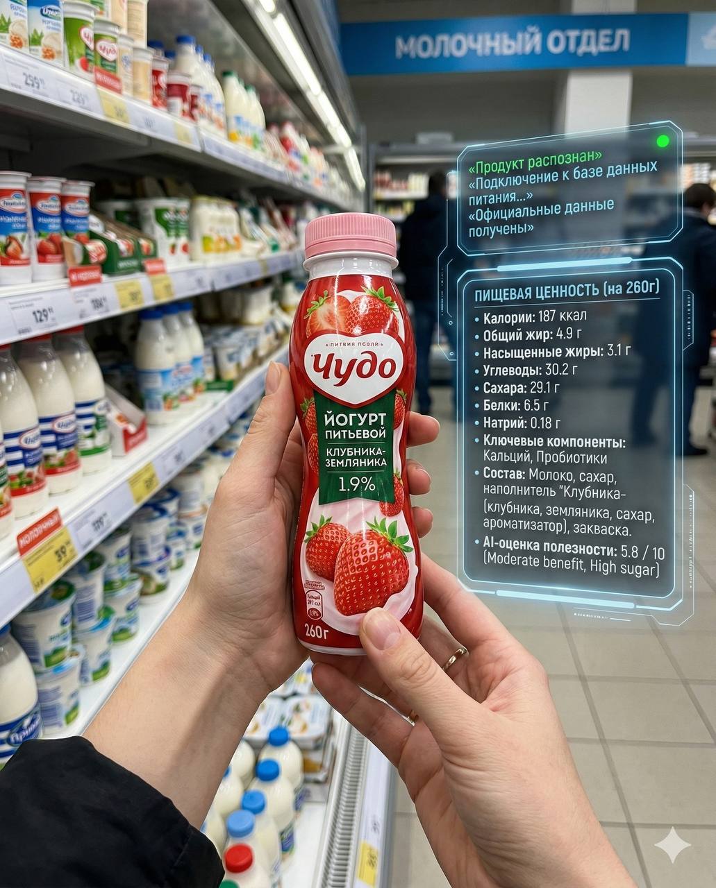 Das Produkt ist im Rahmen zentriert, scharf fokussiert, sehr detaillierte Textur (Glas, Kunststoff, Metall, Karton - je nach Produkttyp), realistische Reflexionen und natürliches Materialverhalten. Hintergrund: Supermarktregale mit sanfter Unschärfe und geringer Tiefenschärfe. Natürliches kommerzielles Licht mit dezentem indirektem Licht. Auf der rechten Seite des Bildes wird eine futuristische, halbtransparente, holografische KI-Schnittstelle erzeugt. Die KI-Schnittstelle liest NICHT den sichtbaren Verpackungstext. Stattdessen führt sie eine Produkterkennung durch und ruft die OFFIZIELLEN standardisierten Nährwertangaben für genau dieses kommerzielle Produkt aus einer globalen Lebensmitteldatenbank ab. Der gesamte Schnittstellentext MUSS auf Russisch angezeigt werden. Fügen Sie subtile Systemmeldungen in russischer Sprache ein: «Produkt erkannt», «Verbindung zur Nährwertdatenbank hergestellt...», «Offizielle Daten erhalten». Das HUD zeigt dynamisch standardisierte Nährwertangaben für dieses spezifische Produkt an: