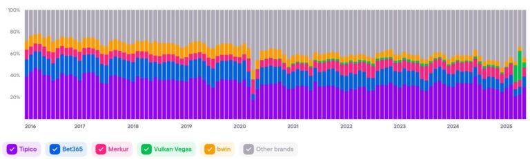 Indicates the aggregate level of engagement and interest in all brands in a country. This indicator serves as a barometer for the iGaming industry and combines various indicators to give an overview of trends and changes in the market.