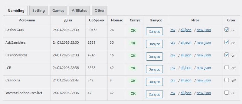 I have another thing in my «internal kitchen». Every day, it checks popular review sites for new entities (online casinos, bookmakers, games, partners, etc.).