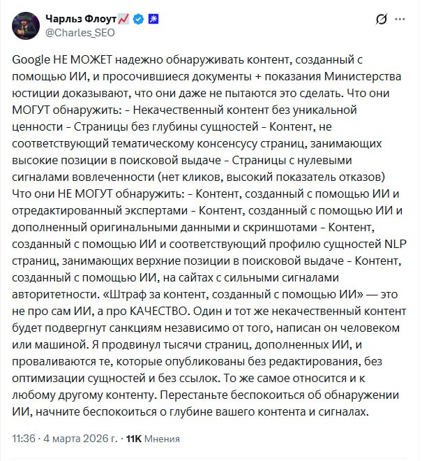 По мотивам треда Чарльза Флоута можно сделать простой вывод: Google не «наказывает за ИИ‑контент», он последовательно выкашивает масштабный, некачественный, бесполезный контент — неважно, кто его писал, человек или нейросети. Алгоритм смотрит на ценность для пользователя, глубину проработки темы и сигналы вовлечения, а не на «процент уникальности» или факт использования ChatGPT.