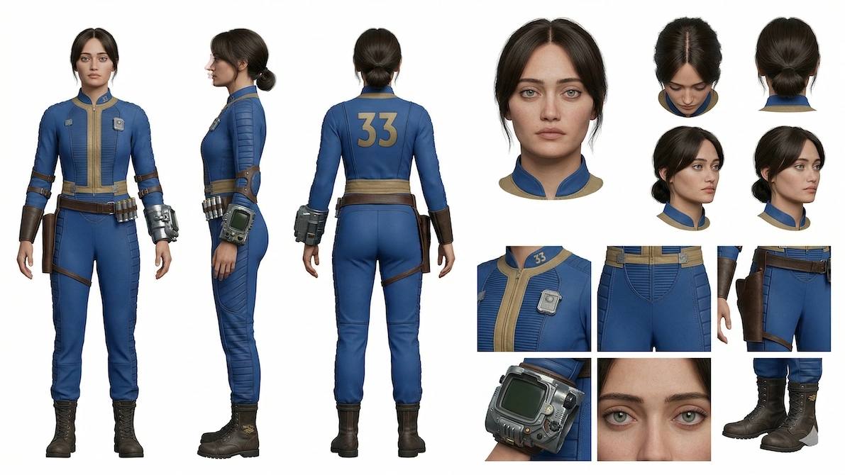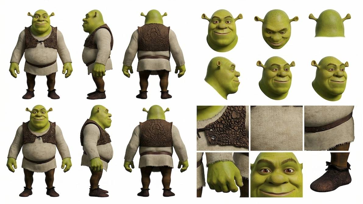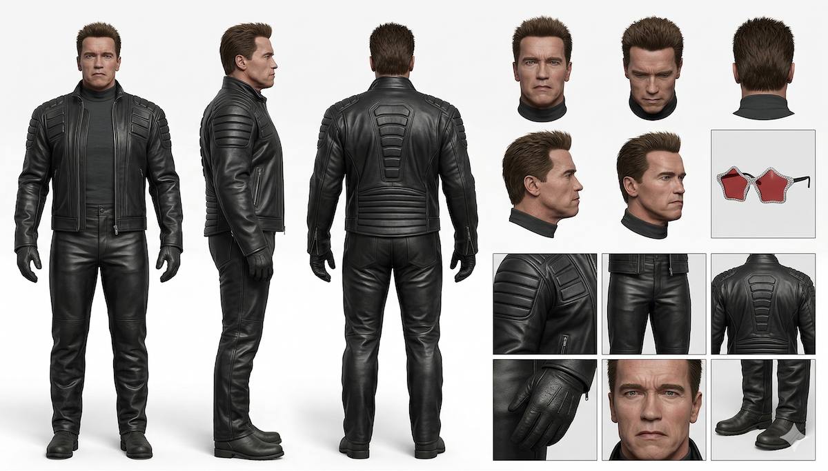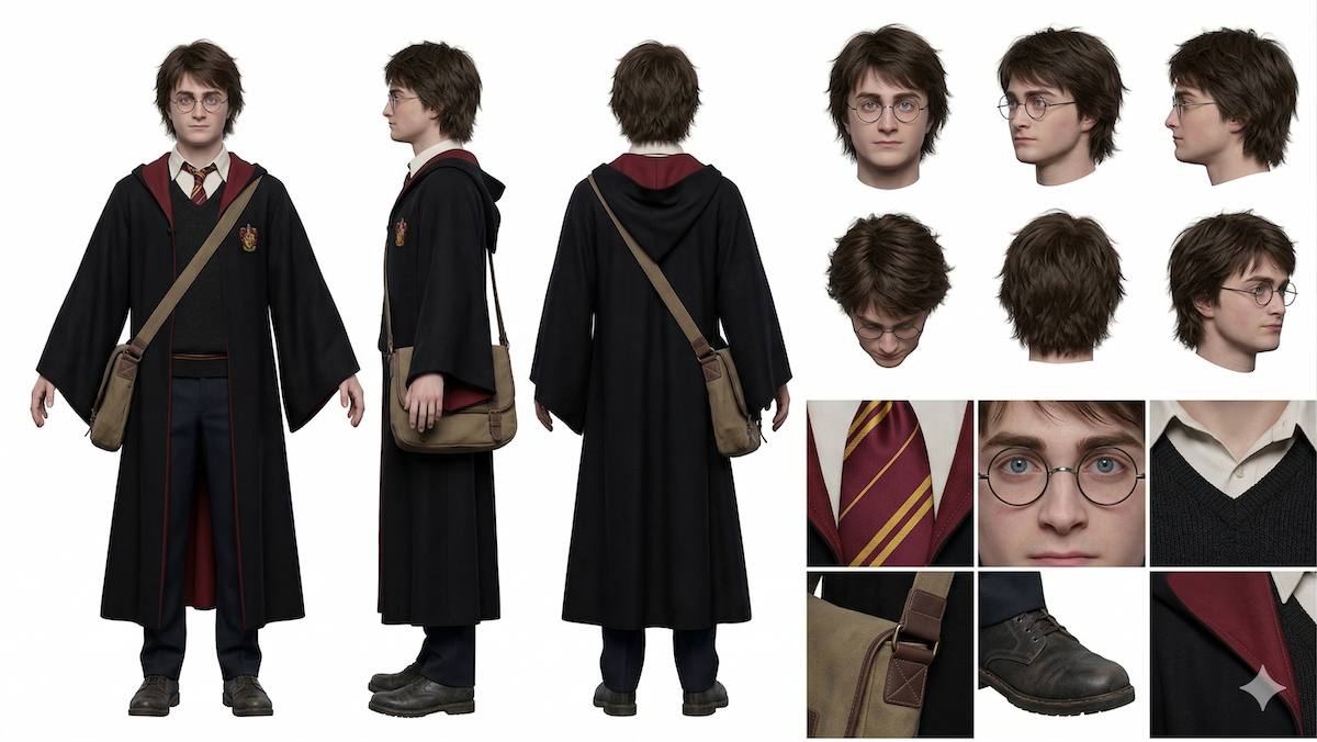 La solución: crear una hoja de referencia donde el personaje esté capturado en su totalidad—altura completa (frente, lado, espalda), ángulos de cabeza y detalles clave (ropa, zapatos, texturas).