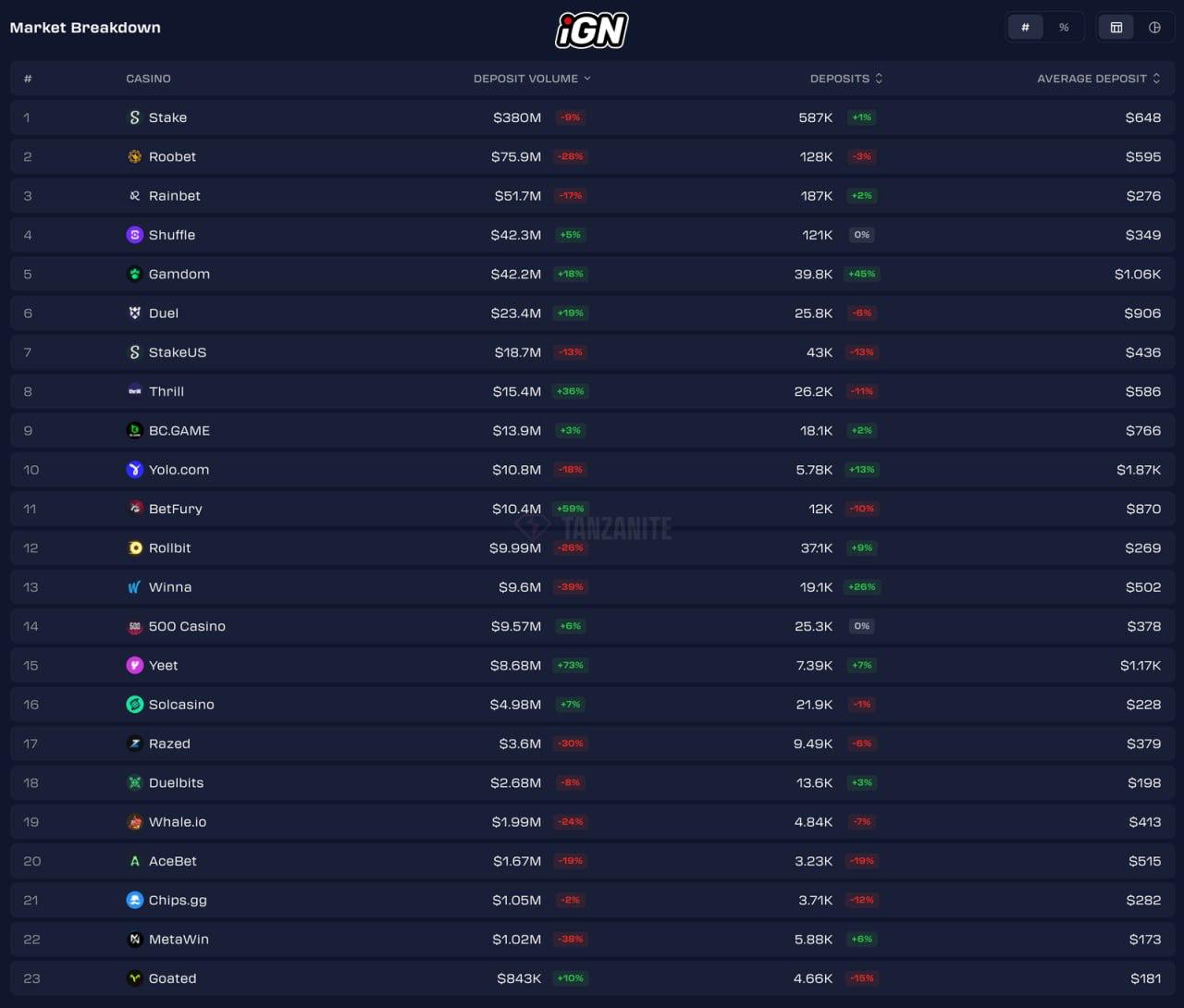 Объём депозитов у Gamdom вырос на $9,4 млн (+18%), у Duel на $4,5 млн (+19%), у Yeet на $4,32 млн (+73%). Наибольшее снижение у Stake на $38 млн (−9%), у Roobet на $33,1 млн (−28%) и у Rainbet на $7,3 млн (−17%). Число депозитов у Gamdom выросло на 45%, у Winna на 26%. Наибольшее снижение числа депозитов у AceBet на 19%, у Goated на 15%. Самый высокий средний депозит у Yolo.cоm $1,87 тыс, самый низкий у MetaWin $173.