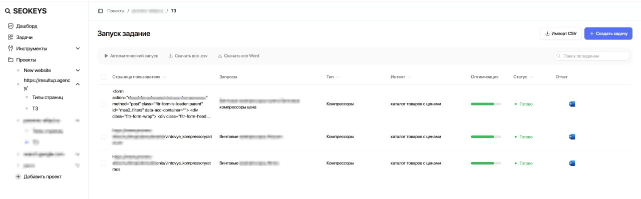 Я хочу иметь банальную возможность загрузить таблицу с сотней строк, где каждая строка — это отдельное задание, нажать кнопку и пойти спать, сэкономив себе на этом часы на, кхм, дрочеве по ручному запуску проектов, и получить сотню ТЗ на выходе. И после этого я хочу нажать кнопку «Скачать все» и получить также 1 таблицу, где в каждой строке будет 1 отдельное ТЗ, которое я могу уже загнать в агента и генернуть за раз по этому списку сотню текстов, ну или по старинке дать эту таблицу копирайтеру, чтобы он просто шел по ней и писал тексты. Ну и, разумеется, не терять возможность скачать отдельные выгрузки архивом.