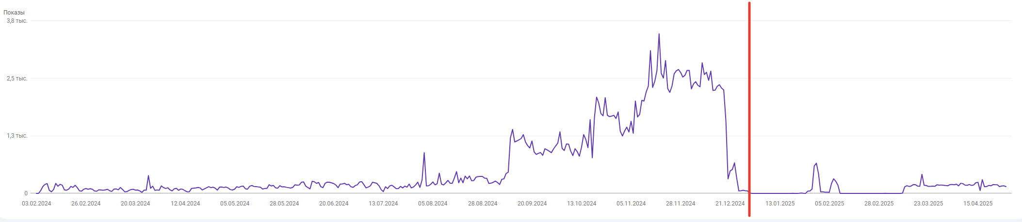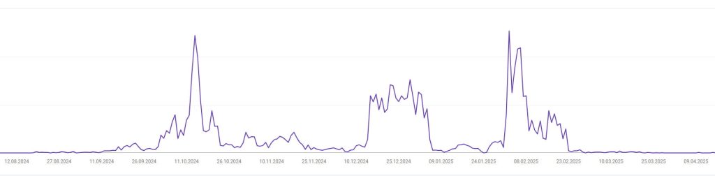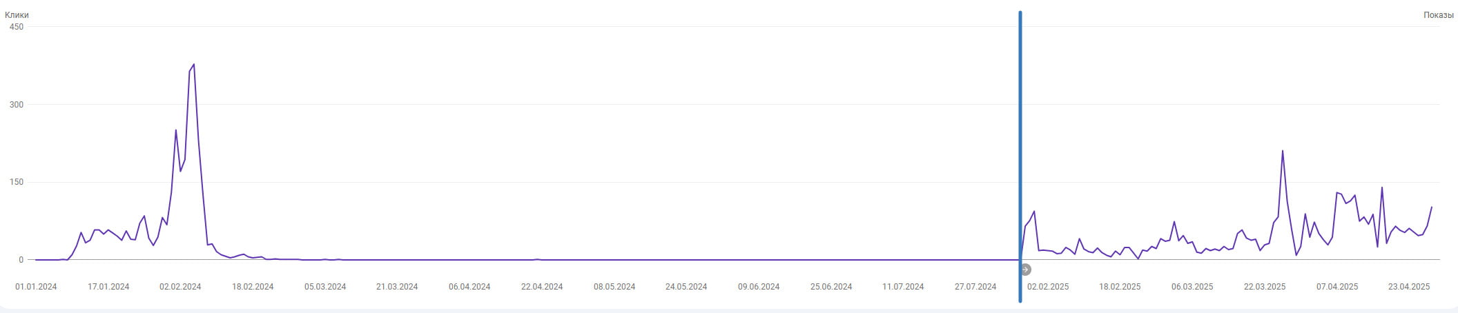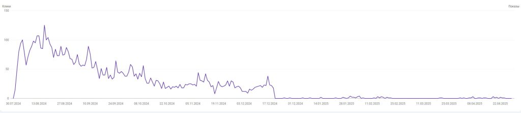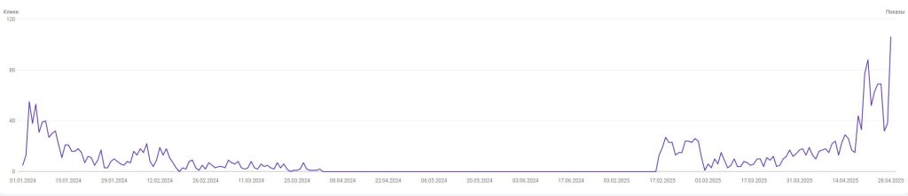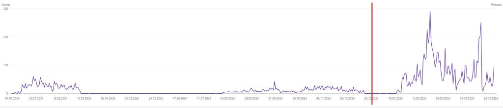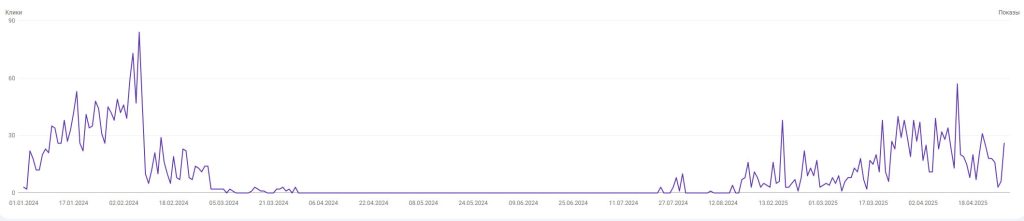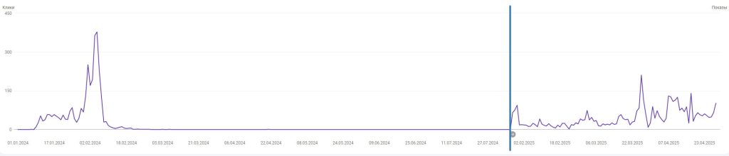 Брендовый сайт под онлайн-казино, страна Азербайджан. Домен свежий новорег в .com, контент ИИ. Ситуация как описано в цитате выше — сайт получил рост видимости и трафик, но через какое-то время улетел в ноль. Долгое время просто лежал (продолжал работать). Синей полосой отмечен момент подклейки. Купил старый азербайджанский дроп в зона .com, практически без показателей и который ранее уже использовался под какой-то мусор с азиатскими символами. По сути пара ссылок и кое какая история, больше ценности у дропа никакой. Но на удивление это дало толчок сайту и медленный рост видимости. Ранее ссылки не покупались. Примерно в феврале 2025 куплены ссылки, но ощутимого воздействия на сайт пока не произошло.