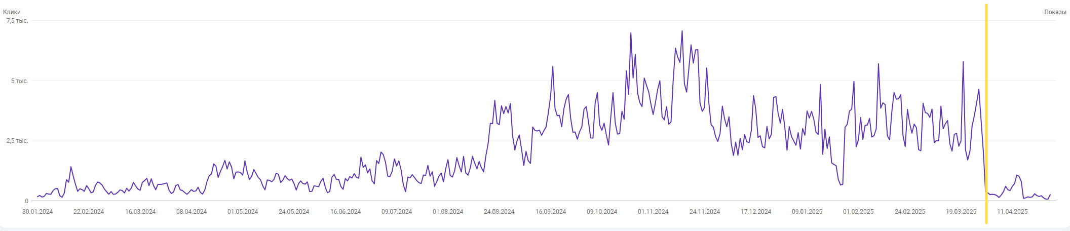 Брендовый сайт под онлайн-казино, мультиязычный под большое количество стран. Основной язык английский. Домен свежий новорег (.top), контент ИИ. В течение года стабильный медленный рост. Ни одной ссылки не куплено. Основной трафик из Индонезии. Желтой линией обозначено падение трафика, предположительно из-за обновления Google в апреле 2025 (покосило огромное количество разных сайтов, в частности брендовых).