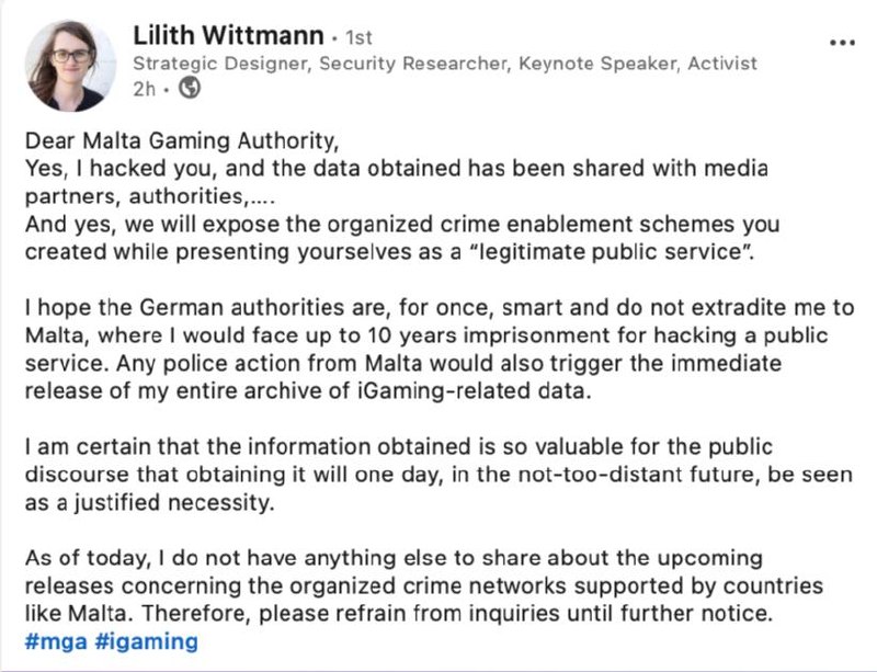 Uma garota chamada Lilith Wittmann declarou em sua página do LinkedIn que ela é a responsável pelo recente hackeamento de um dos sistemas internos da MGA.