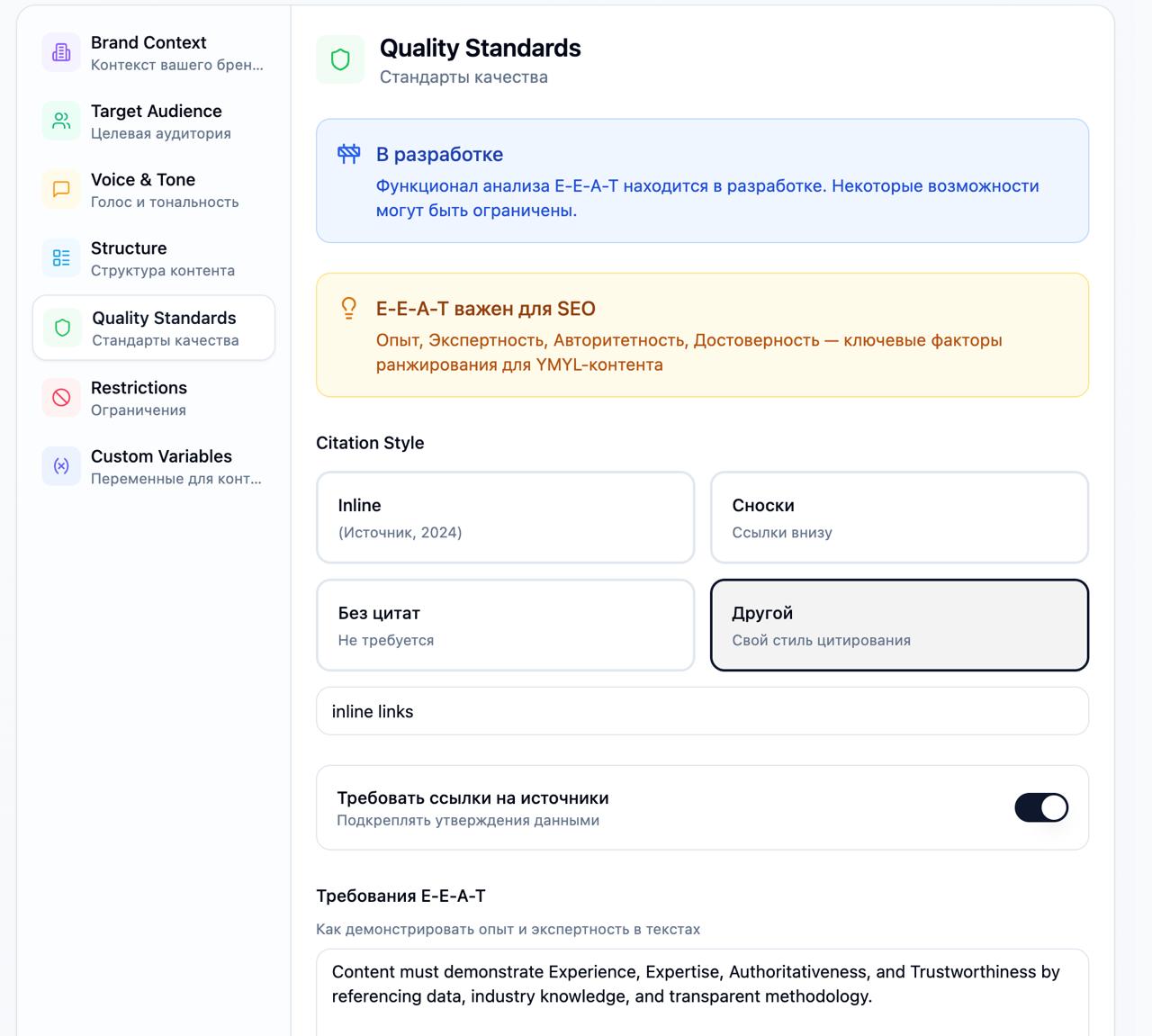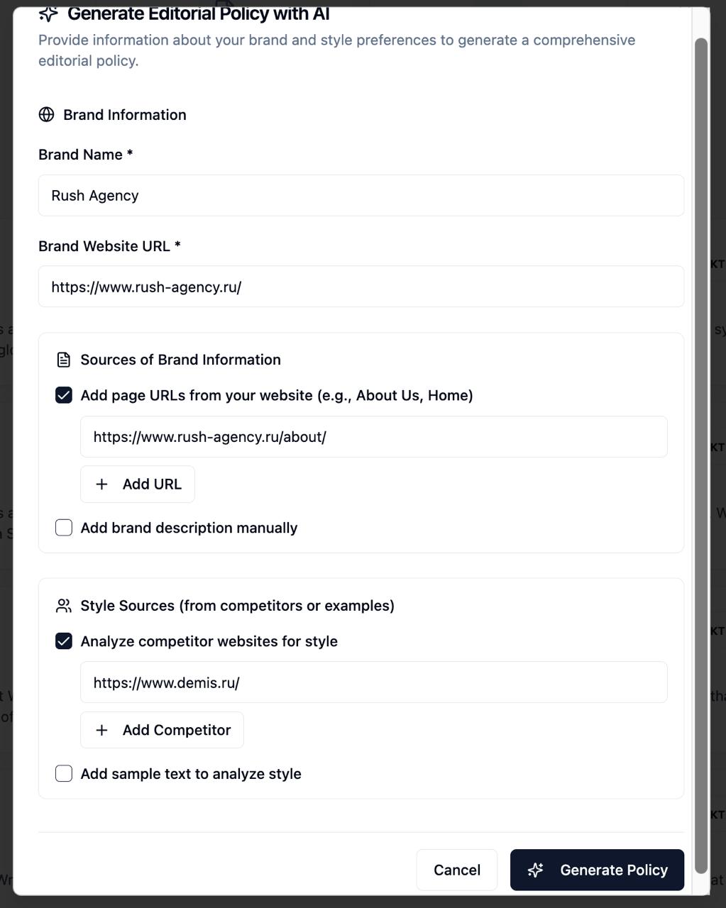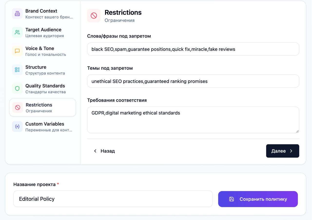 Редакционные политики: сделали удобный Визард в котором вы можете выбрать все нюансы, которые хотите чтобы агент учитывал при генерации текста:
