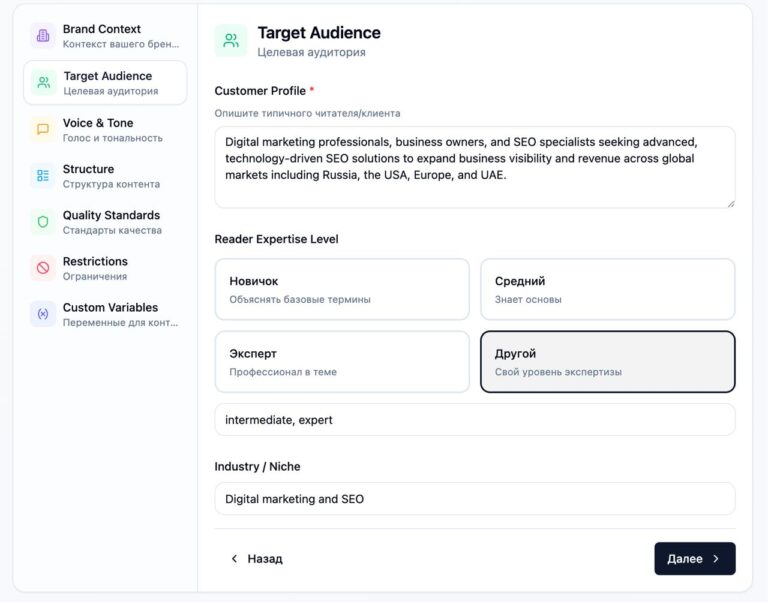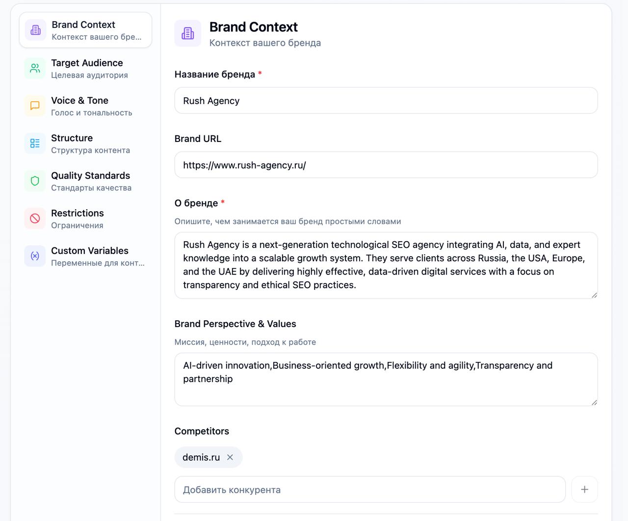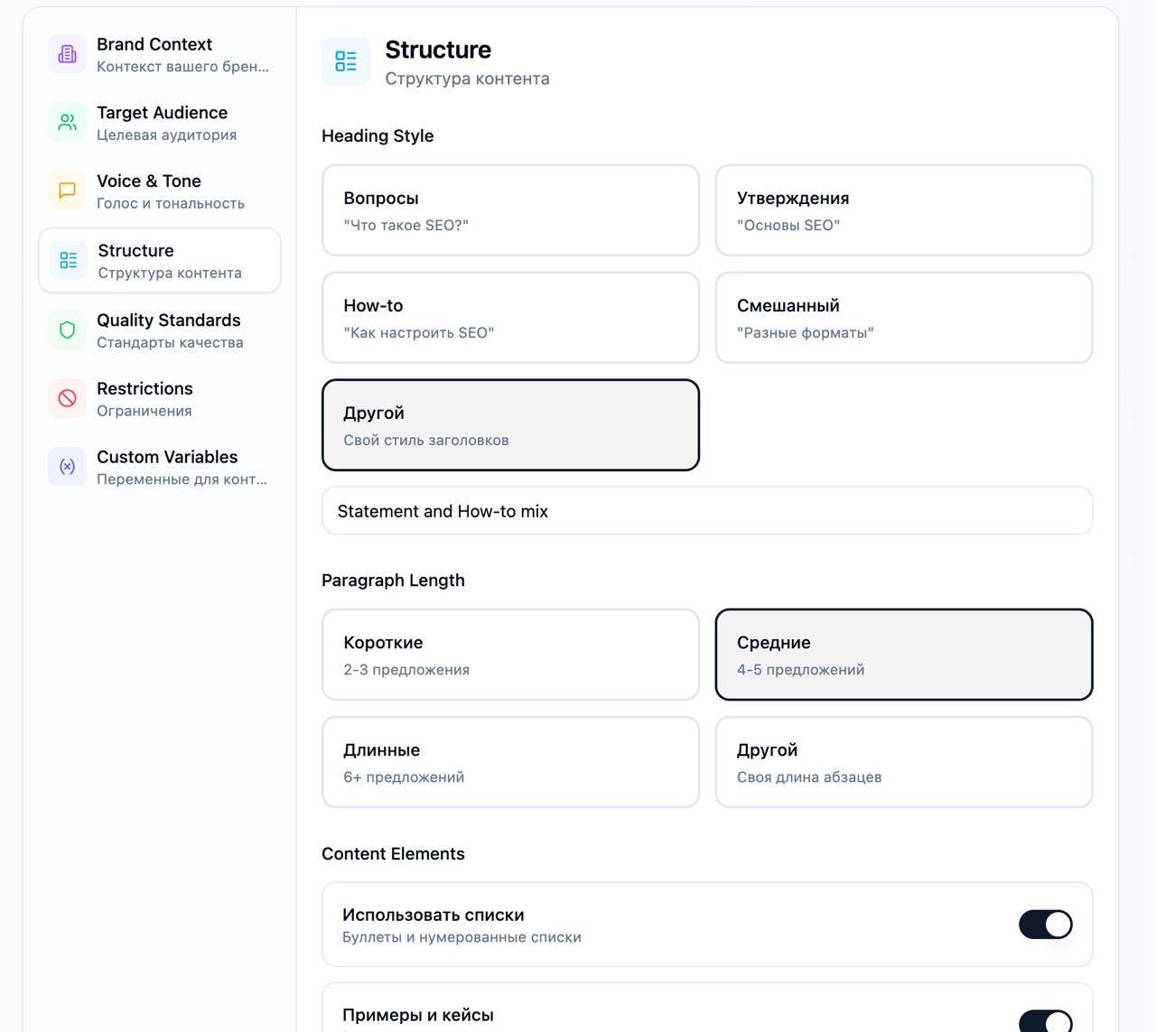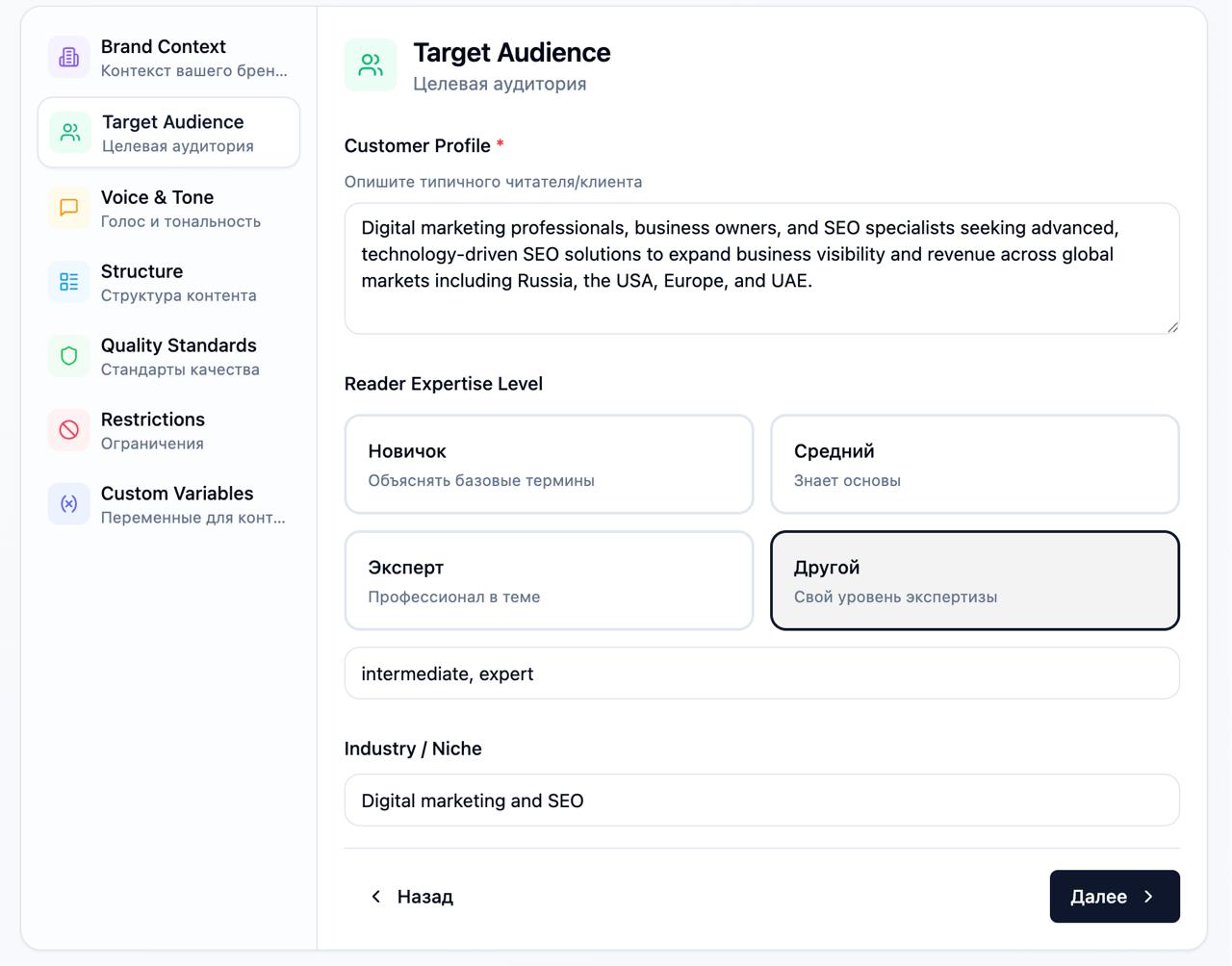 Редакционные политики: сделали удобный Визард в котором вы можете выбрать все нюансы, которые хотите чтобы агент учитывал при генерации текста: