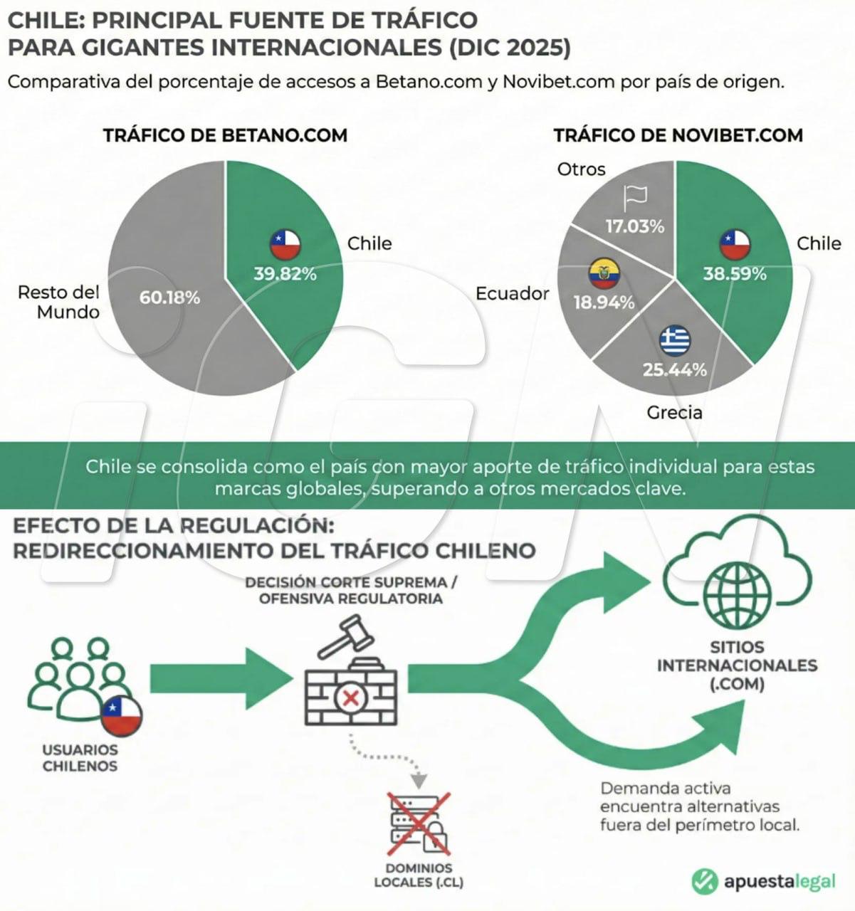В Чили после блокировки iGaming-сайтов в доменной зоне .cl игроки перешли к офшорным операторам и обеспечили 39,82% мирового трафика Betano
