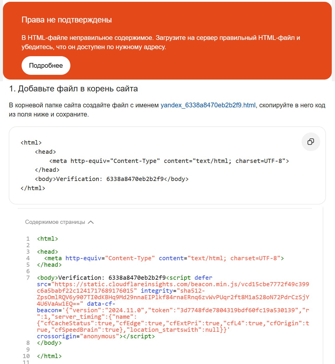 Раньше всегда использовал для верификации HTML-файлы, но в какой-то момент Яндексе видимо начал не просто проверять есть ли в файле verefication-id, а еще и целостность файла проверять, чтобы там ничего лишнего нет. А Cloudflare в свою очередь пихает в этот файл дополнительный JS, в итоге ЯВМ агрится, что в «HTML-файле неправильное содержимое».
