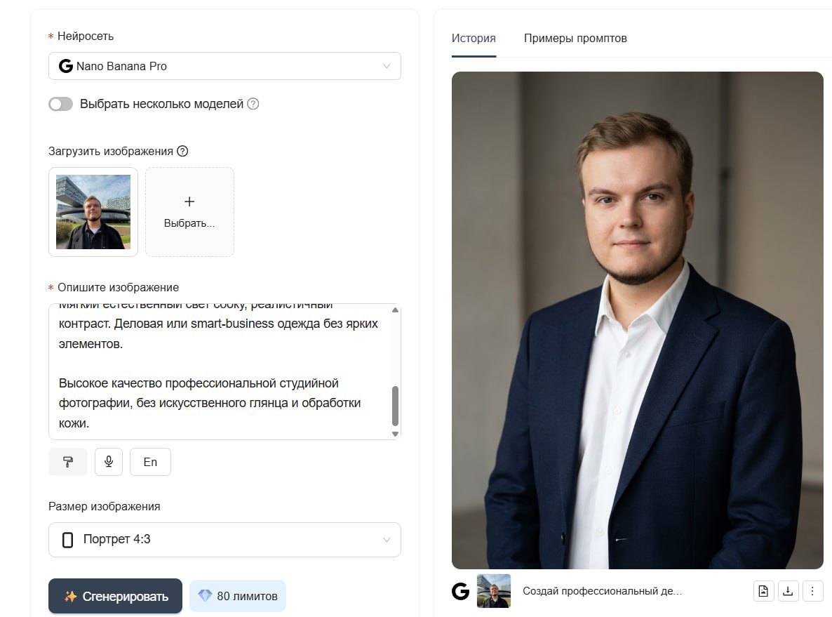 Загружаете какое есть фото в ИИ, выбираете модель Nano Banana Pro и даете промпт, который сделает из обычного фото качественное, сохраняя все черты лица.