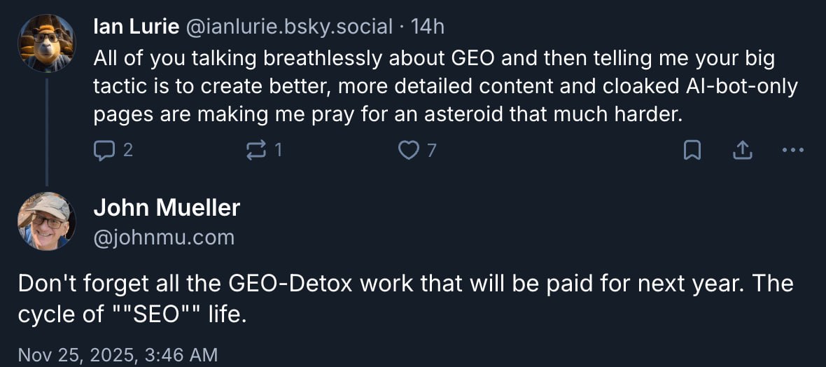 — Все вы, затаив дыхание, говорите о GEO, а потом рассказываете мне, что ваша главная тактика — создавать более качественный, подробный контент и замаскированные страницы, предназначенные только для ИИ-ботов, — и это заставляет меня еще сильнее молиться об астероиде.