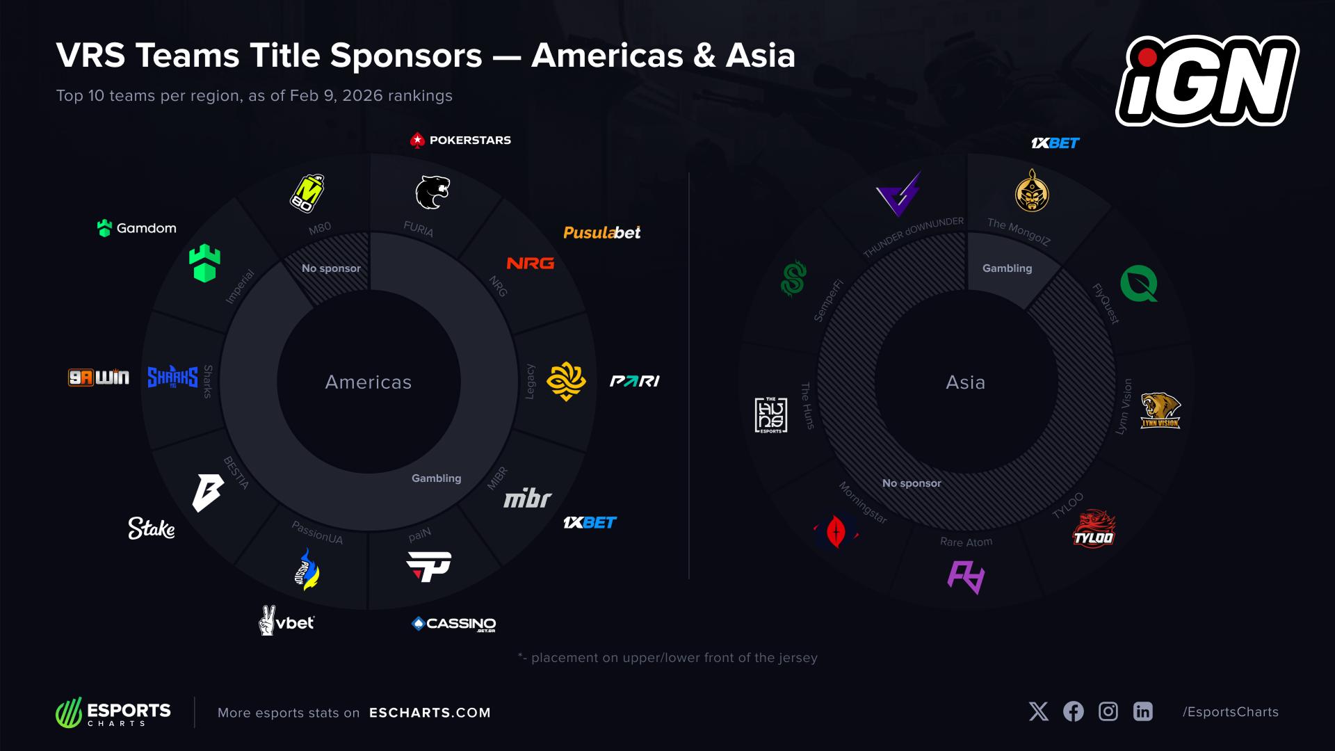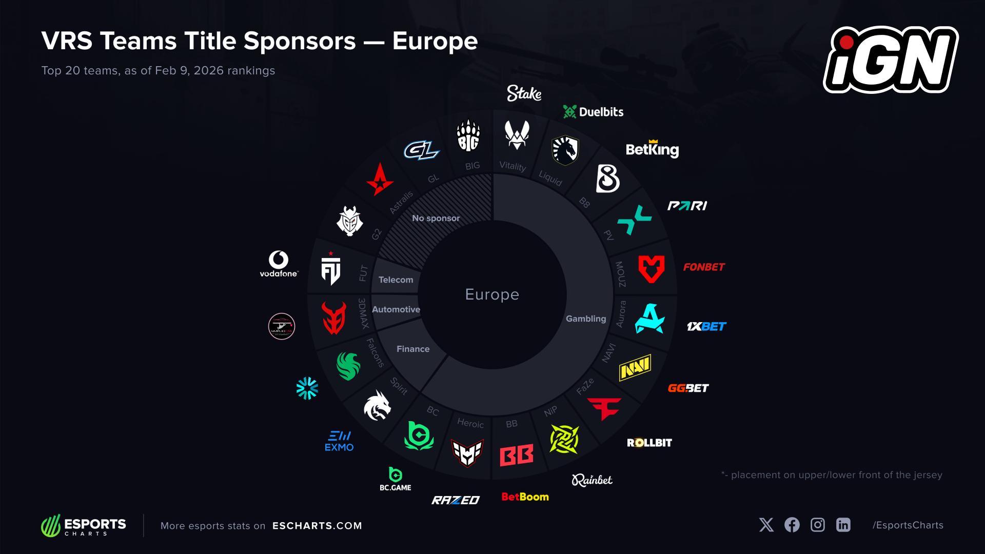 Портал Esports Charts опубликовал обзор, посвящённый титульным спонсорствам среди ТОП-команд по Counter-Strike 2 на основе рейтинговой системы Valve (VRS) по состоянию на 9 февраля 2026г. Редакция iGN выделяет следующие ключевые данные: