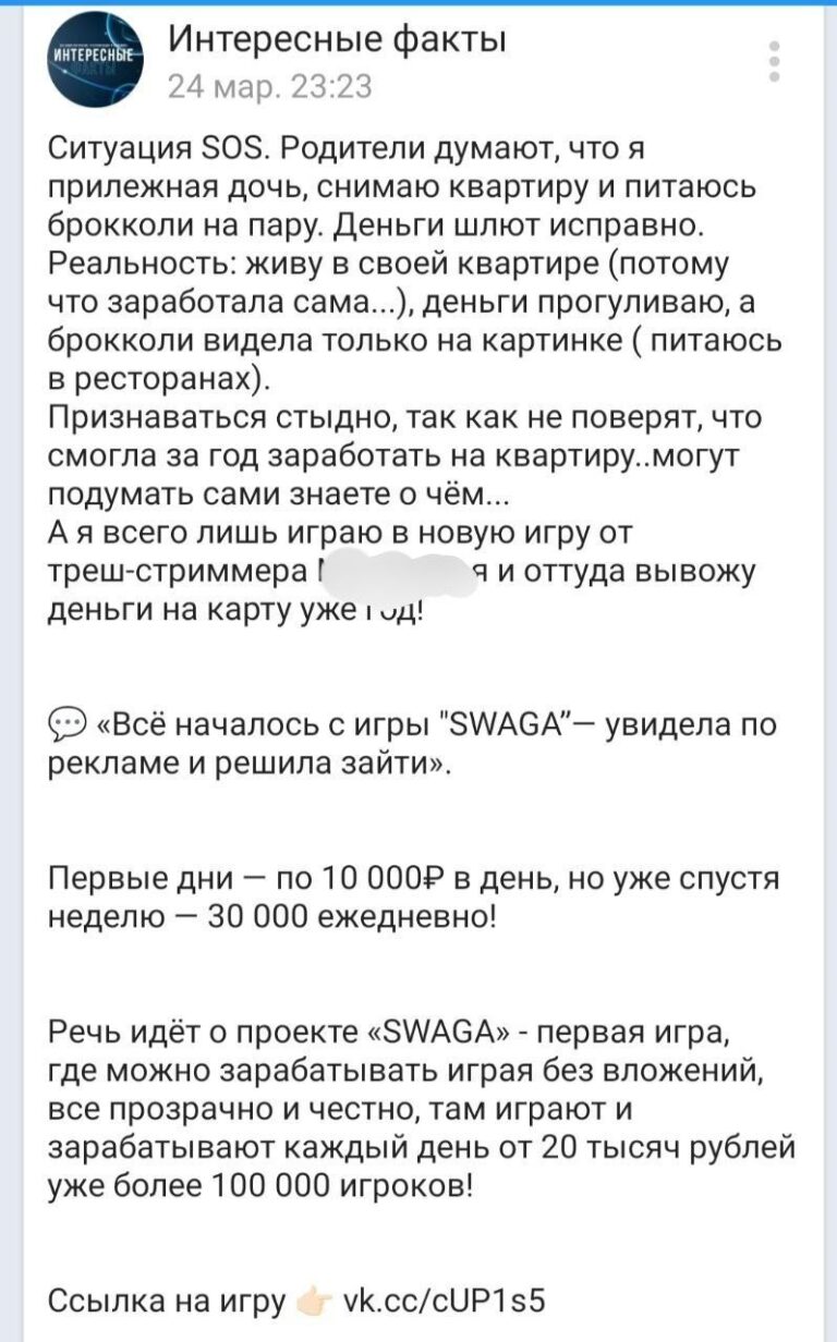 Мораль: не лейте скам, не марайтесь. Но что самое интересное, модерка VK это спокойно пускает даже без проклы в виде TG. То ли влияет траст пабликов, то ли — деньги не пахнут. Как и всегда.
