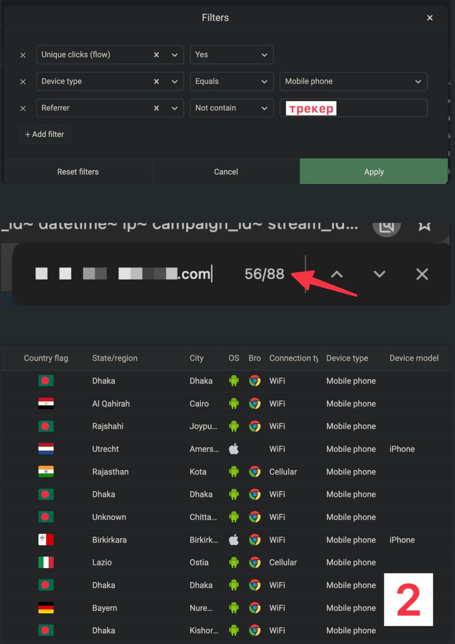 Как вот в этом примере на скрине — 44 клика (site.com светится в 2 колонках сразу поэтому в 2 раза ниже) и одно ГЕО в трекере — можно работать с ним.