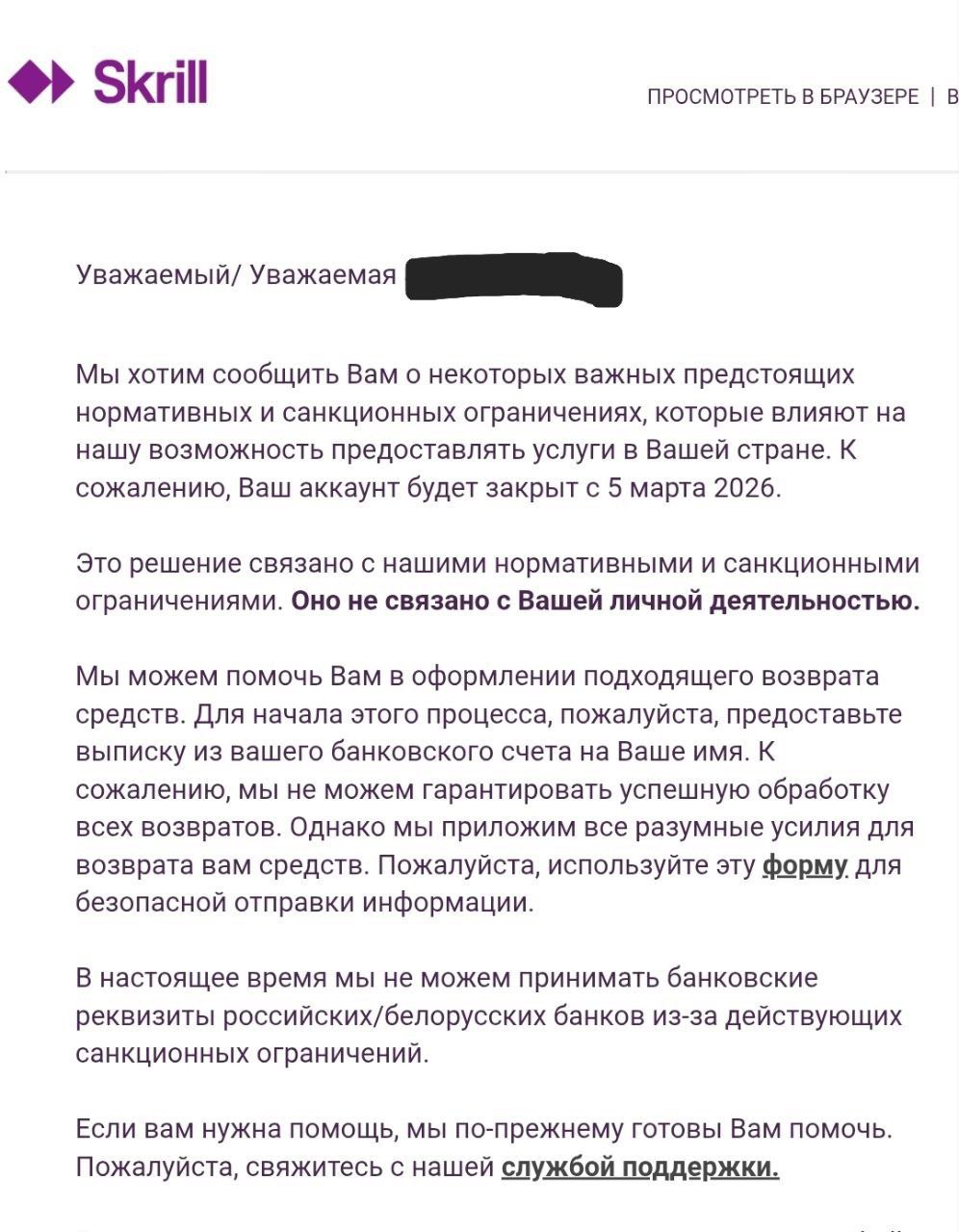Skrill закрыл счета гражданам РФ / РБ. Предлагают вывести средства, но только на банковский счет за пределами РФ / РБ.