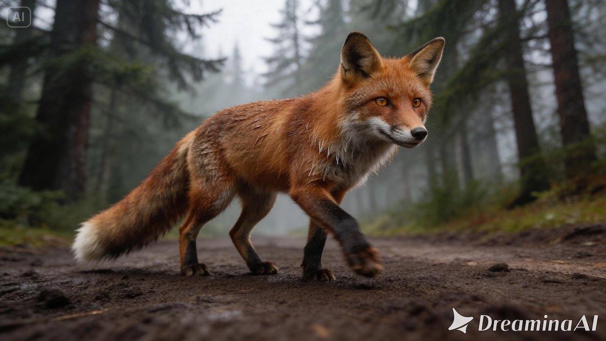 Пример: an adult red fox with dense slightly wet fur, narrow muzzle, alert ears, bright amber eyes, and a long bushy tail with a pale tip, walking carefully along a…