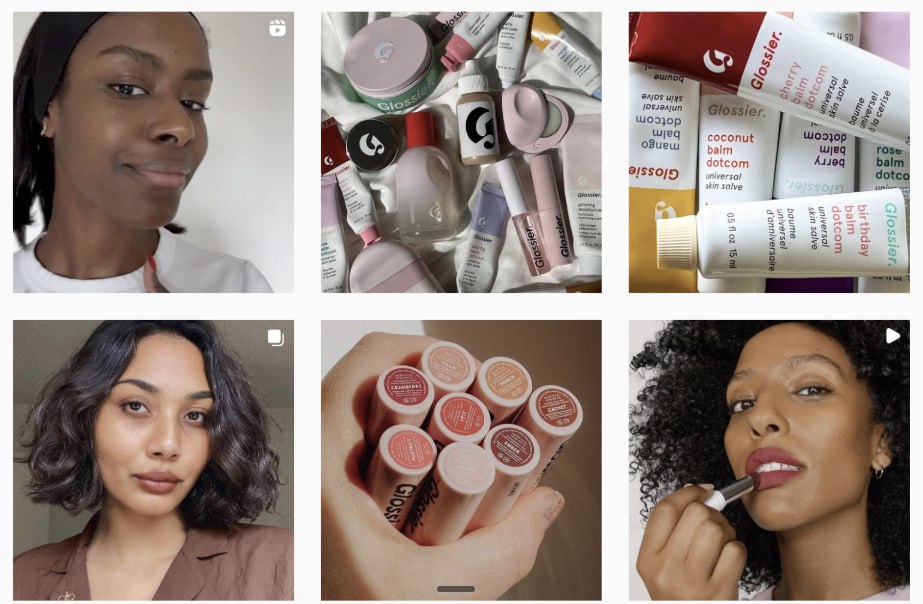 ⚡ Пример — лента бренда Glossier, заполненная контентом, демонстрирующим, как реальные люди используют их продукцию. Они размещают у себя селфи, обзоры и отзывы клиентов.
