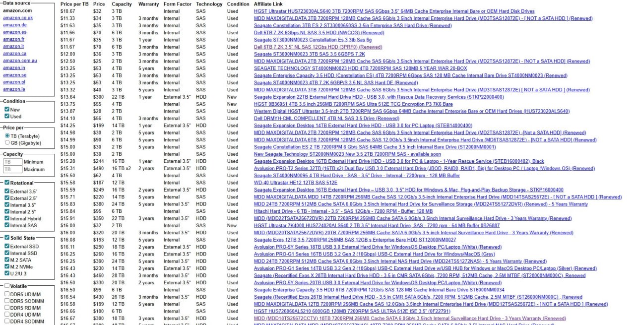 Сайт чем-то напоминает TractorData, который я публиковал раньше. Никакого нормального дизайна. Никакой структуры. Просто таблица с ценами на жёсткие диски, отсортированными по цене за терабайт.