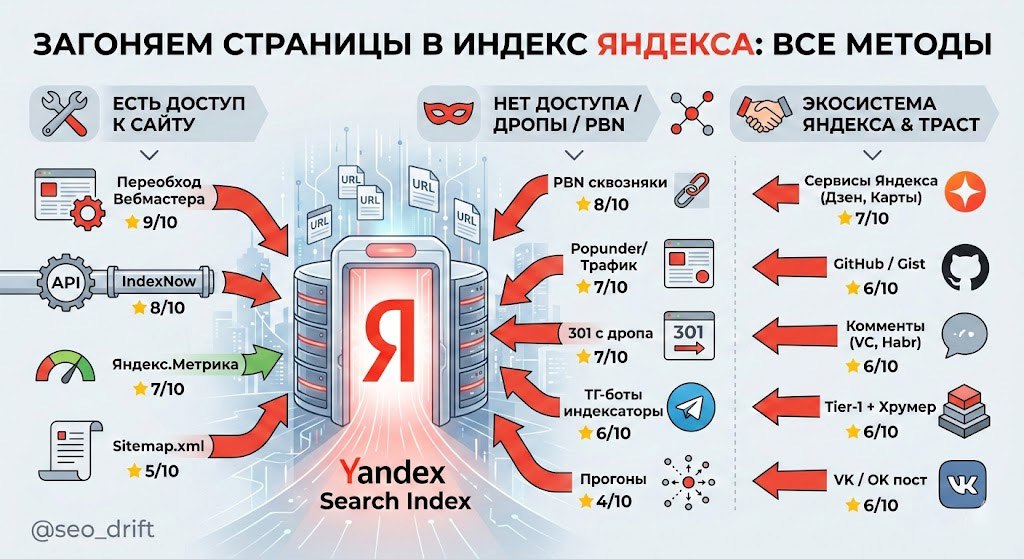 Пост → ссылка → Яндекс мониторит соцсети экосистемы → индексНе использую. Яндекс активно мониторит соцсети, VK заходит быстро. Хороший бесплатный способ если уже есть аккаунт с активностью.
