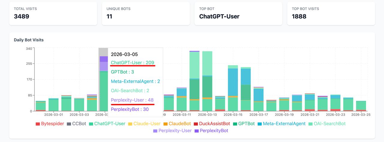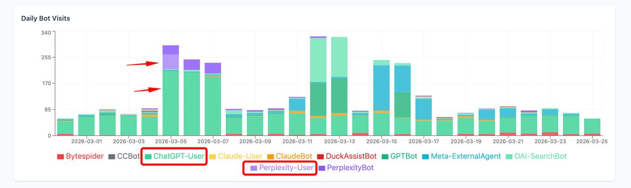 На скрине видно как в первые три дня я манипулировал с тыяч разных IP отправкой обычных Fetch-ботов, которые просто «читают» страницу сайта — для ChatGPT это ChatGPT-User, для Perplexity — Perplexity-User
