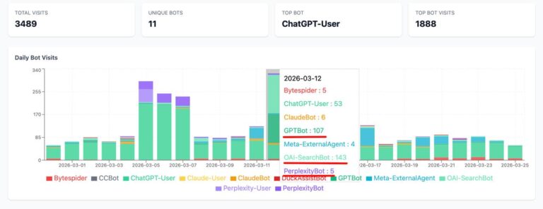 Для тестов пришлось написать свою панельку, которая ловит всех LLM-ботов, которые приходят на сайт.