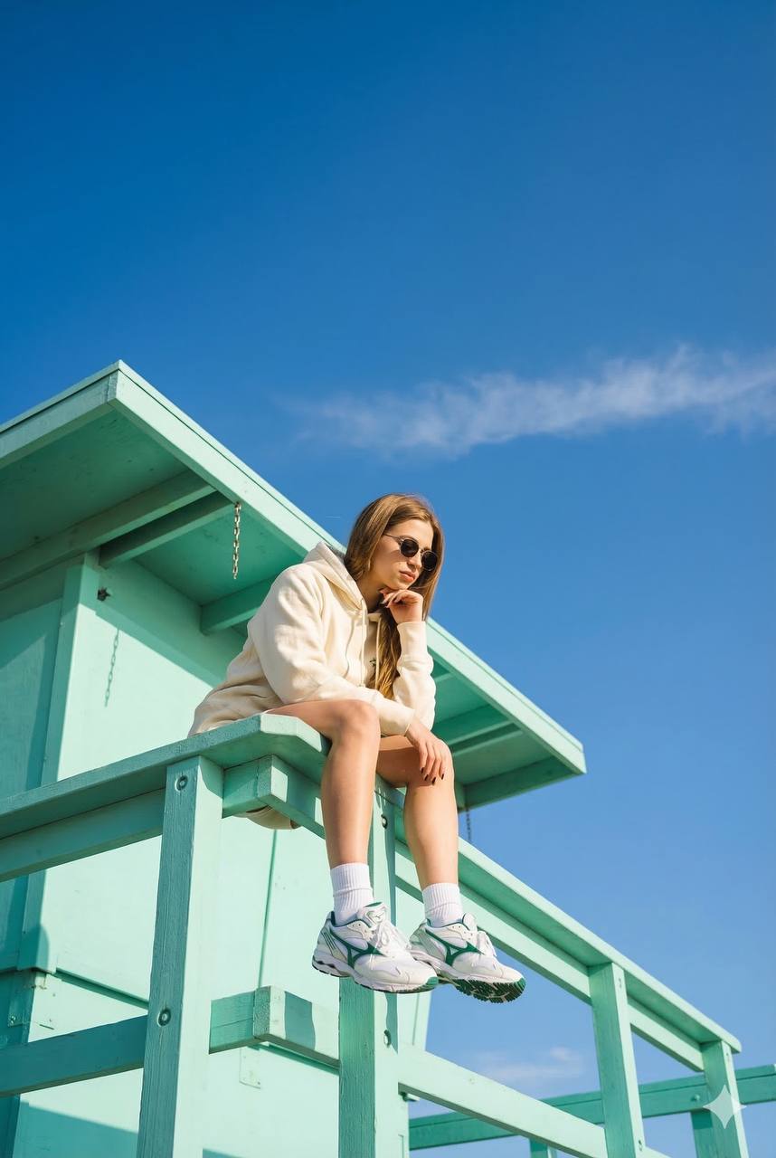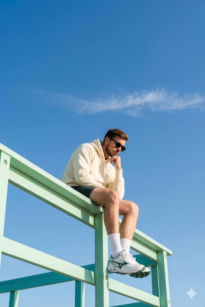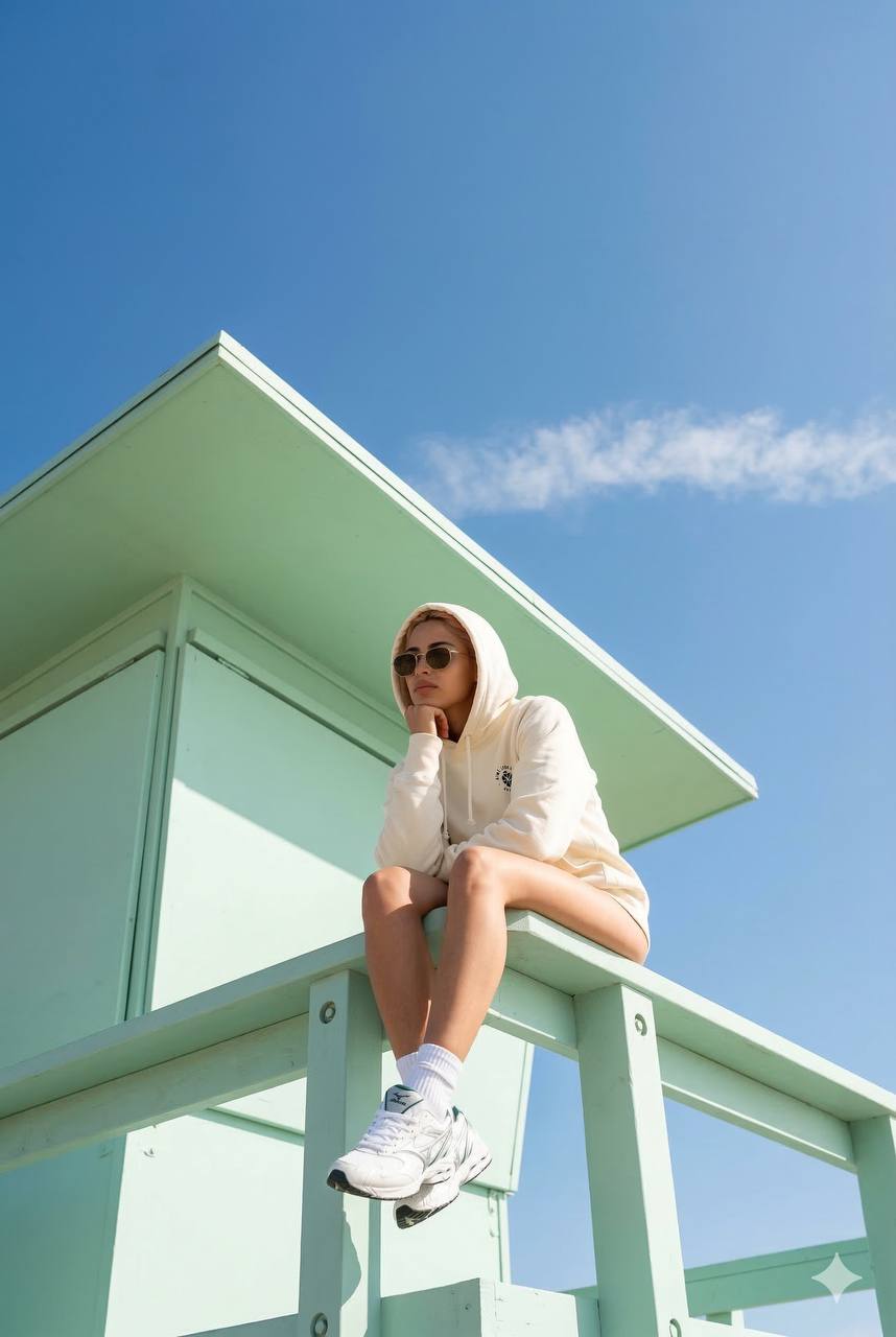 Use the reference image as the identity source. Keep the exact same face, bone structure and body proportions, do not change the person’s face or figure. Low-angle fashion editorial shot, camera positioned below the subject and tilted upward for a dramatic perspective. The person sits on the front edge of a mint/turquoise beach lifeguard tower, body turned about 45° from the camera (three-quarter view). Head slightly lowered, gaze directed downward and slightly to the side, calm detached expression, one hand sup…