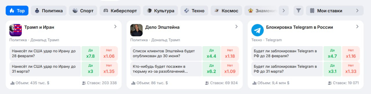 Как и на Полимаркете, здесь есть разделы: «Политика», «Культура», «Знаменитости» и т.д.