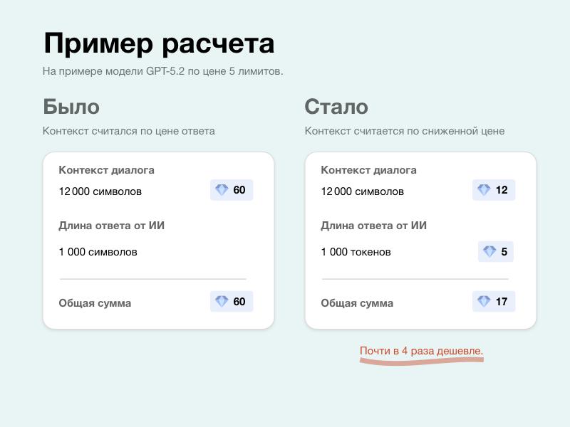 Статья сообщает об обновлении схемы расчета стоимости ИИ-чатов, в которой теперь стоимость диалога зависит от объема контекста и количества токенов, что значительно снижает общую стоимость использования.