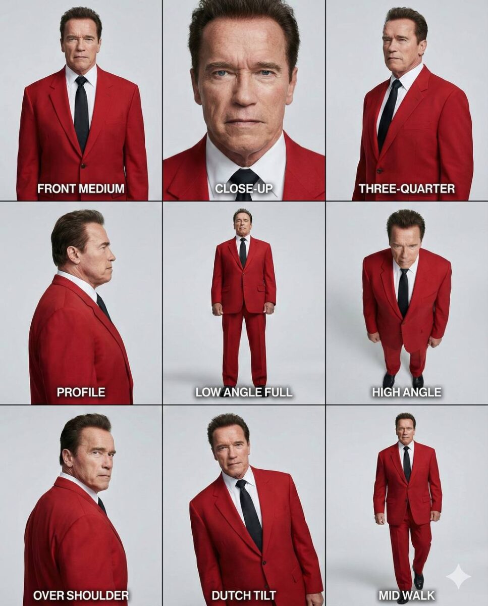 High-resolution Editorial Angle Reference Sheet. Perfect 3×3 grid. Aspect ratio 4:5. Strictly use attached selfie as identity reference. Maintain 100% facial consistency across all 9 panels (same face, age, hair, skin tone, proportions). Wardrobe…